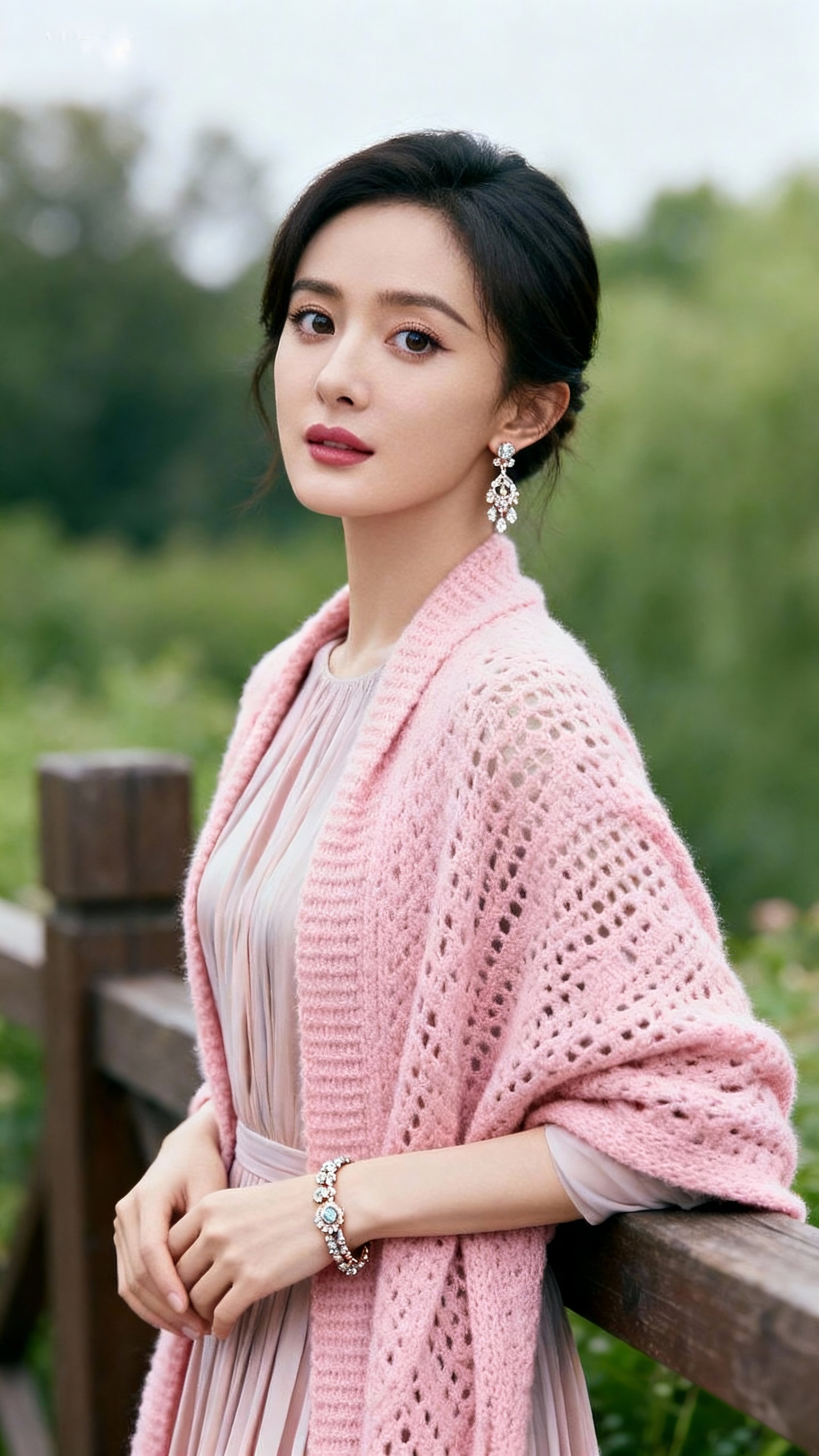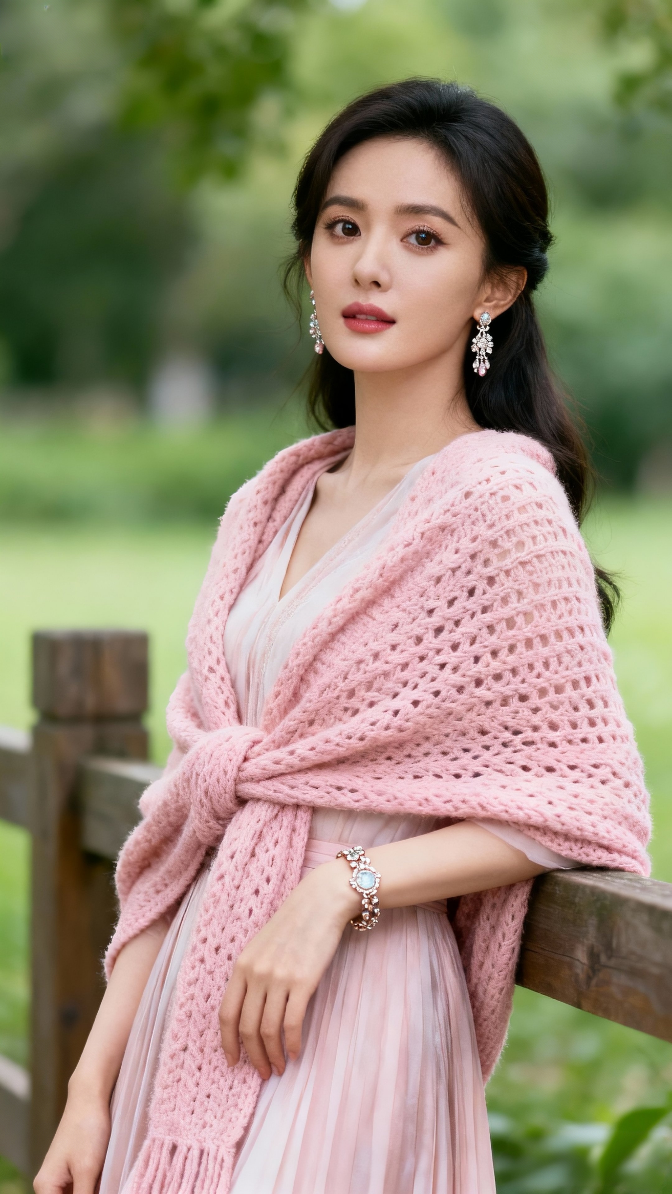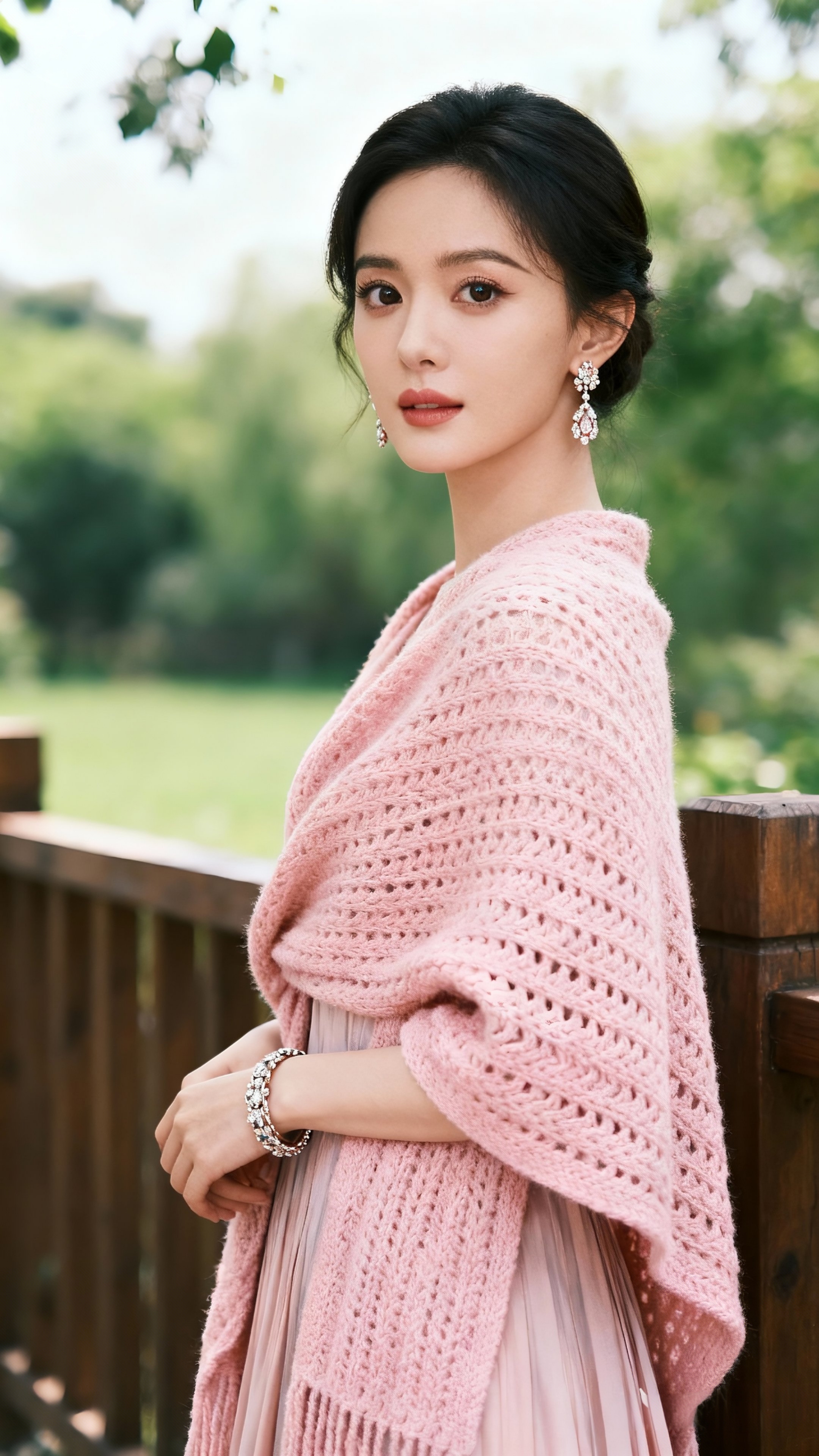 她身着浅粉百褶裙,外搭镂空针织披肩,裙摆随风轻扬,满是浪漫感。乌黑秀发高盘,露出纤细脖颈与精致耳坠,灵动又显脸小。眉眼弯弯带笑,眼眸清澈有神,鼻挺唇润,五官精致得恰到好处。在绿意盎然的户外背景下,整体造型清新雅致,温柔气质扑面而来,妥妥的行走画报~