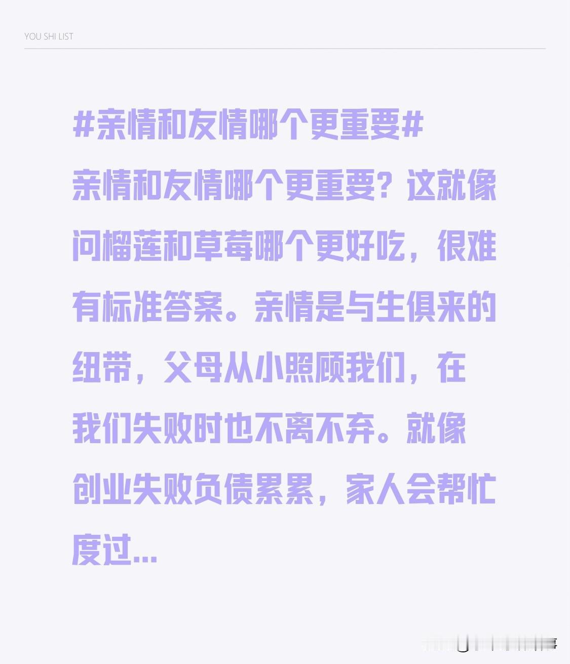 亲情和友情哪个更重要?这就像问榴莲和草莓哪个更好吃,很难有标准答案。 亲情是与生俱来的纽带,父母从小照顾我们,在我们失败时也不离不弃。就像创业失败负债累累,家人会帮忙度过难关。而且家族的价值观和文化通过亲情传承,影响我们一生。 友情则是自主选择的。我们能和志同道合的朋友一起谈天说地。遇到困难时,有时怕家人担心,会选择和朋友倾诉,他们能提供解决方向,还能带来情绪价值。 所以,亲情和友情都不可或缺,都是人生宝贵的财富。