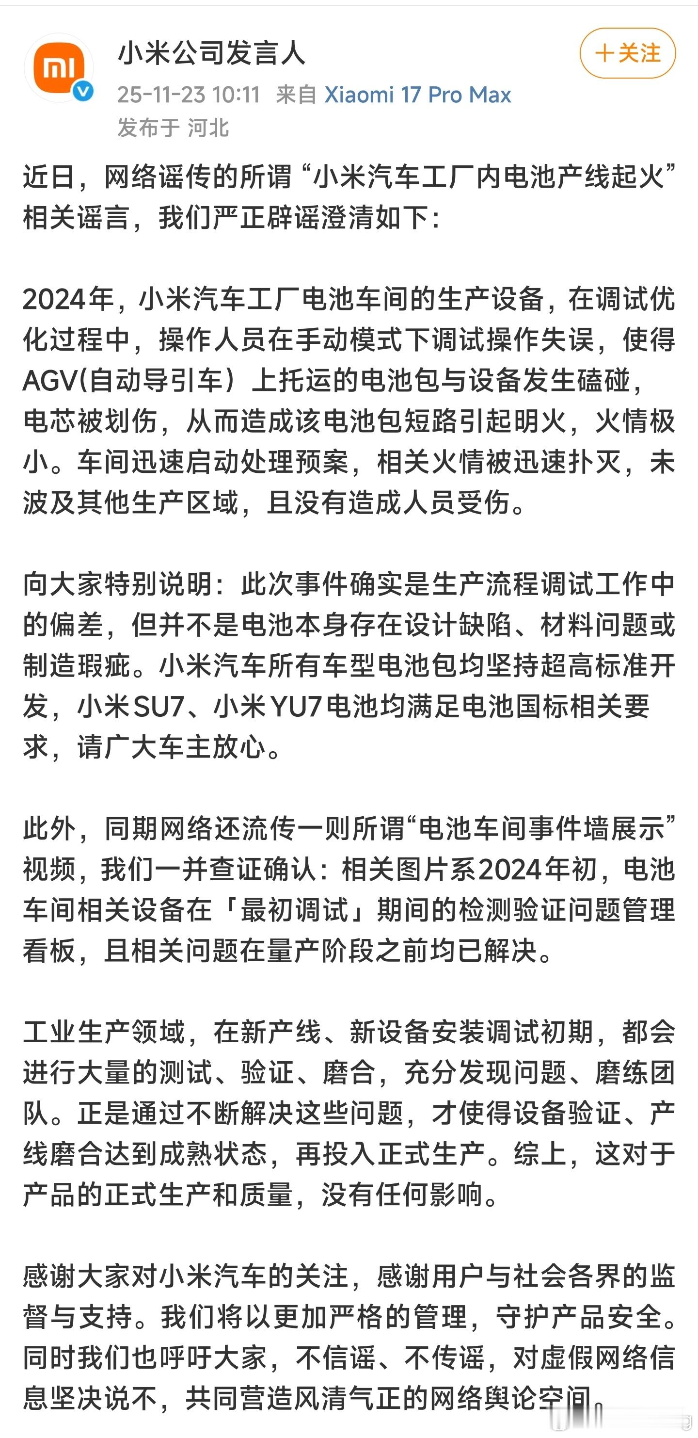电池产线起火的谣言小米也出来辟谣了,是去年年初产线调试时候操作不当出的问题,和后续正常生产一点关系都没有,望周知。最近小米对谣言辟谣的速度都很快,这个趋势不错 值得点赞