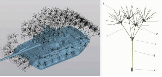 俄罗斯一款防无人机“蒲公英”坦克获得了专利 该发明涉及保护固定和移动物体免受FPV-无人机撞击的被动保护手段。被动保护装置包含一组由柔性材料制成的杆,彼此相连,形成树状结构,形成体积屏障。树结构包含多个层级。 每个层级都有不同尺寸和横截面的柔性杆。上层由小段的杆组成,下层由大横段的杆组成。梯度中的杆数从下到上增加,通过轻量级连接元件连接。 柔性杆由不同部分的玻璃纤维配件制成。连接元件由模制的金属板材或抗冲击塑料制成。树木结构的上层之间,由合成高强度材料制成的网状物展开,该材料具有精细的细胞结构。
