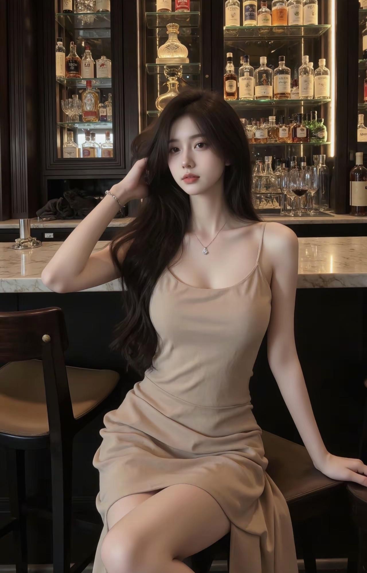 吧台暖光裹着酒柜的细碎光泽,裸色吊带裙衬得氛围刚好。长发漫过肩线时,连空气都软了半分。