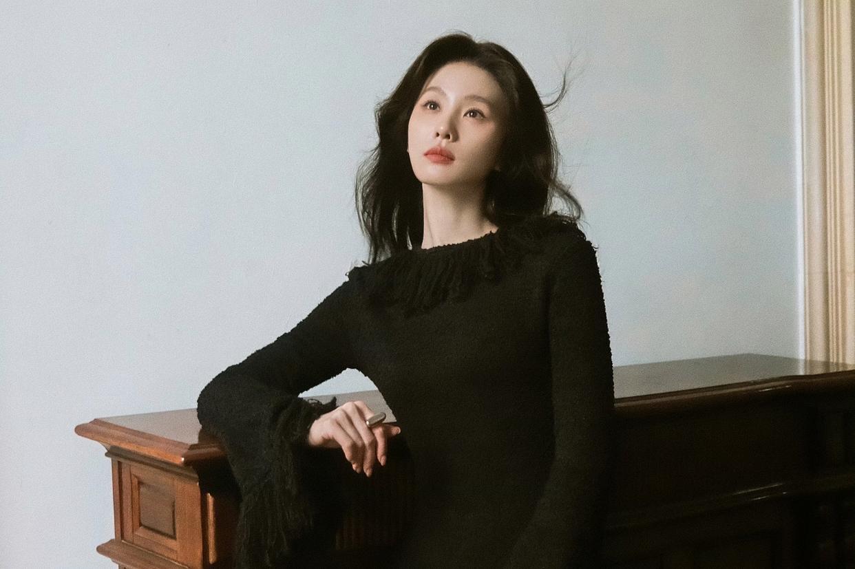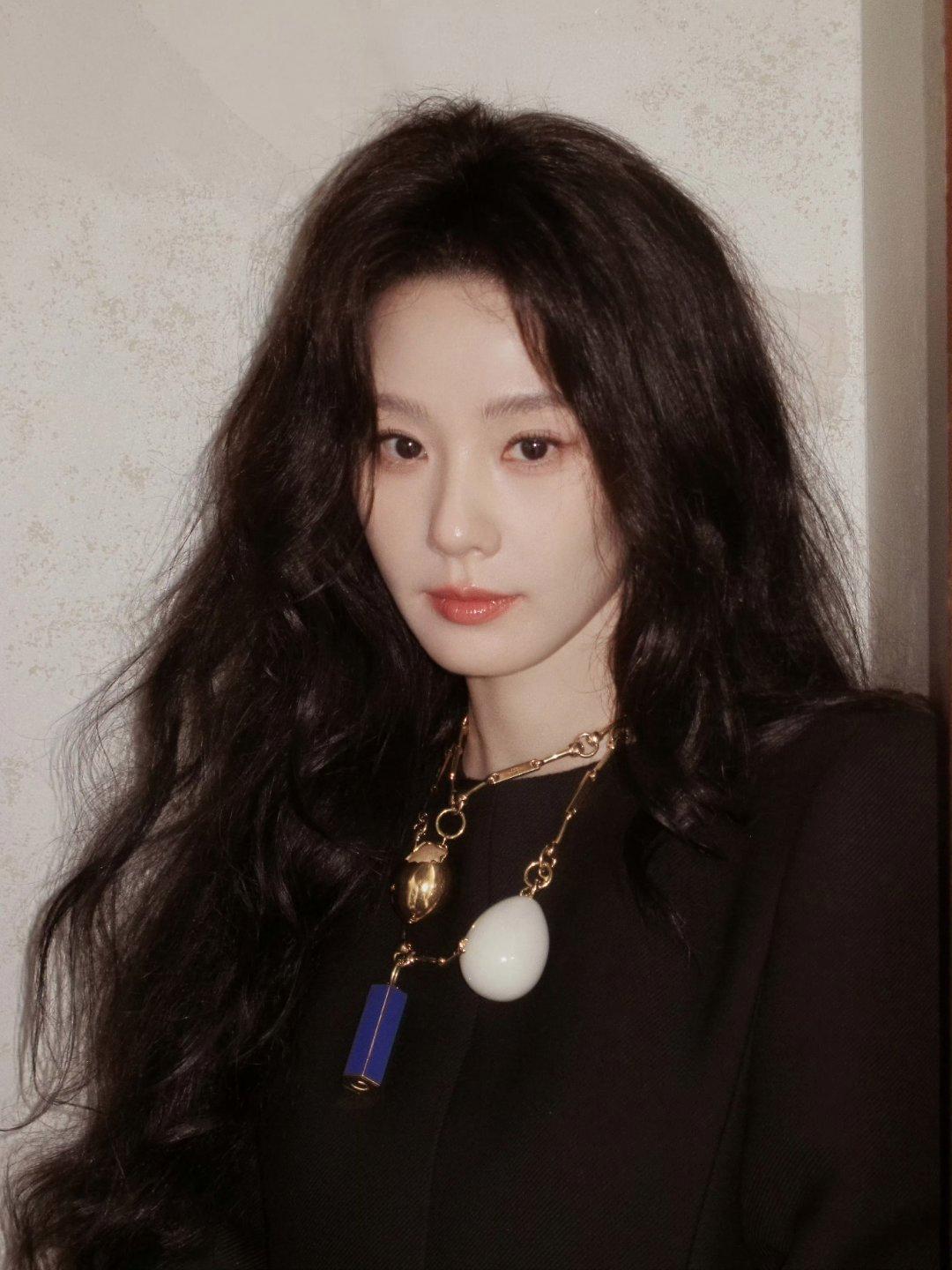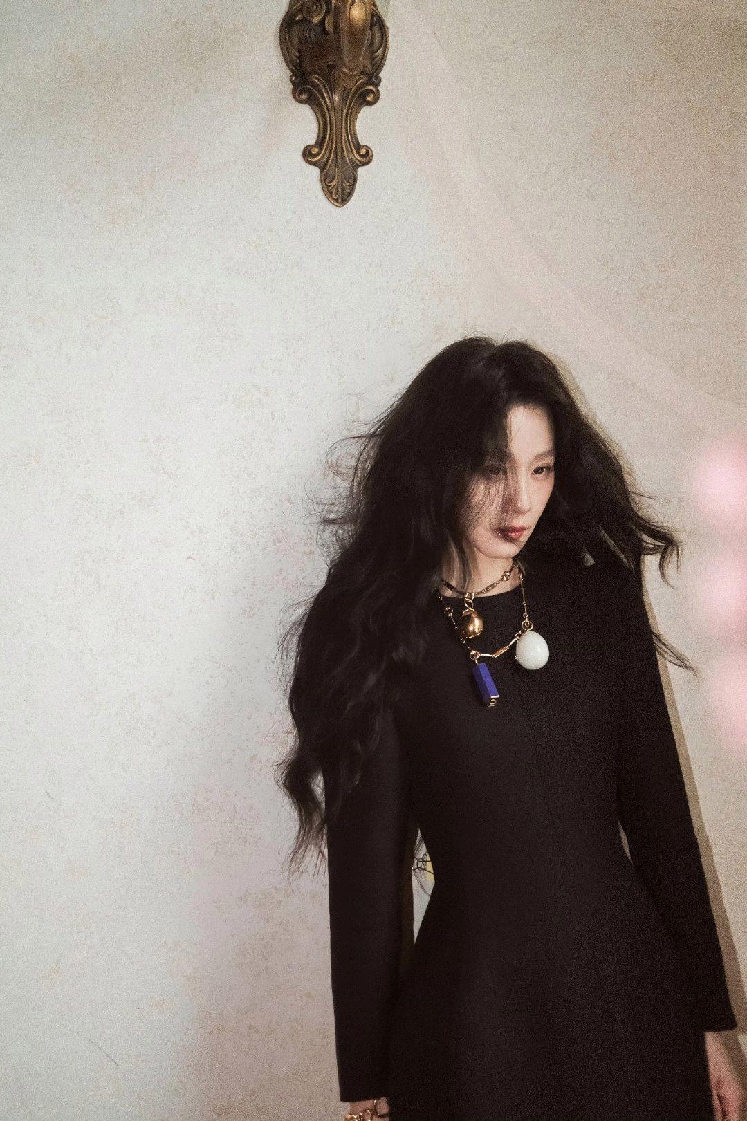 刘诗诗蜷在雕花椅背的瞬间,像从老派欧洲庄园走出来的贵族小姐—— 黑裙的金扣是暗夜里的碎光,微卷长发蹭过肩颈的弧度,连发丝都裹着慵懒的贵气
