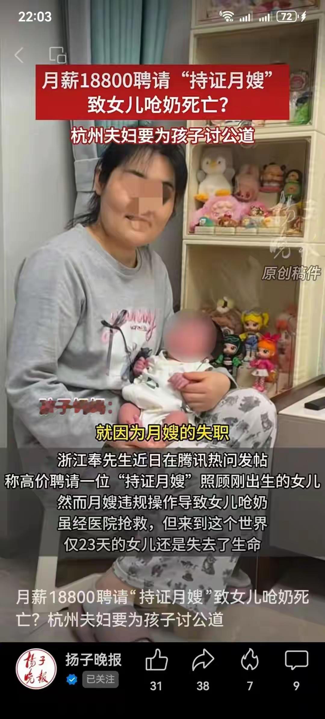 10 月 9 日的这个凌晨,奉先生 1 点 47 分冲好奶粉,7 分钟后交到李某静手上。1 点 54 分,喂奶开始,夜灯的光连宝宝的脸都照不清。两分钟后,呛咳声响起,李某静没停喂,也没喊人。直到 2 点 07 分,孩子妈妈发现女儿嘴唇紫得像冻住的葡萄,追问下,月嫂才含糊一句 “要不送医院”。没过多久,回陕西老家的李某静,已经在朋友圈发求职信息了。她抖音里那些精致的月子餐照片,还是奉先生的妻子之前帮她拍的。如今,奉先生夫妇抱着监控录像、医院报告和基因检测结果,以 “过失致人死亡” 报了警。警方已介入调查。 网友评论: 我不理解为什么能放心把自己身上掉下来的肉交给一个无亲无故仅仅是金钱关系的人去带,说不好听的就连亲妈和婆婆带都还不放心呢 只有亲妈才会全心全意的照顾宝宝,其他人真不能托付,我双胞胎儿子都是我一边一个搂着长大的,确实累但我不后悔 我真的感谢我老公,月子里都是他夜里照顾孩子。我婆婆很早因病去世,我亲妈嗷嗷说照顾我月子,结果钱收了,一毛不拔,我爸在我家作天作地,我妈还护着他。想起来都恨,亲身父母自私自利 养孩子操心啊,我当年坐月子住会所里,仍然不放心,一晚上起来几次看孩子,她们给孩子喂奶洗澡换尿不湿的时候,我都在旁边看着,一刻不敢松懈,出月子回来和婆婆两个一起带着,足足两年多我才去工作。现在十多年过去了,想起来还是感慨万千,坚决不要二胎。所以很多年轻人都不生孩子了,也能理解,确实心力交瘁。 来源:纵深新闻