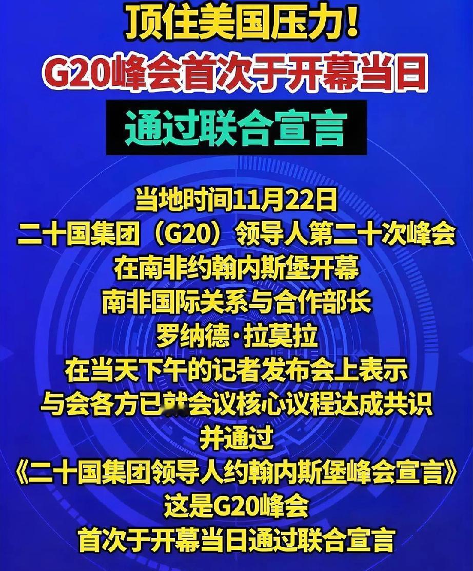 当地时间11月22日至23日,二十国集团(G20)领导人第二十次峰会在南非约翰内斯堡举行,峰会以“团结、平等、可持续”为主题。这是G20峰会首次在非洲大陆举办。 此次峰会前夕,美国总统特朗普抛出所谓“白人农民在南非正遭遇种族灭绝”论调,以此为由抵制峰会并宣布缺席,同时施压南非不得发布集体宣言,宣称美国缺席将导致峰会难以达成共识。这番厚颜无耻的言论遭到南非强硬回击。南非国际关系与合作部部长拉莫拉直言不讳表示,主办方将全力说服与会各国,“不能让缺席的国家拖累国际机构的进程”。 事实恰如其言。峰会开幕首日,据南非广播公司(SABC)报道,南非总统府发言人文森特·马格韦尼亚周六证实,约翰内斯堡G20峰会打破传统,在会议首日便通过了领导人联合宣言。 “我们此前已无限接近达成一致,如今峰会宣言终于正式达成。”他向记者表示。 马格韦尼亚透露,峰会议程出现“小幅调整”:原本应在峰会结束时通过的宣言,被提前列为当日首要议程。这是因为在此前的双边会谈中,各方都赞成宣言应在其余议程推进前完成表决。 白宫精心设计的缺席戏码,反而成了这场非洲首秀最绝妙的背景板。 特朗普团队或许暗自得意,以为少了一张美国座椅就能让整个会场陷入僵局。现实却给了他们一记响亮的耳光——十九国代表用提前二十四小时达成的联合宣言,上演了一场精彩的“去美国化”压力测试。 这哪里是外交僵局?分明是场即兴创作的国际政治实验! 瞧瞧南非政府的操作手法。拉莫拉部长那句“不能让缺席的国家拖累进程”,简直是把外交辞令说出了武侠小说的剑气。要知道,这个国家拥有全非洲最成熟的多边外交经验。 2011年德班气候大会上,南非就曾顶着六国退场的压力促成《巴黎协定》雏形。他们太清楚如何将程序性障碍转化为推进动力。 峰会宣言的提前通关藏着精妙的时间政治学。传统上压轴发布的文件突然被提到开幕首日,这相当于在博弈刚开始就亮出了底牌。 看似违背常规的操作,反而消解了某些国家利用谈判周期制造变数的空间。马格韦尼亚透露的“小幅调整”,实则是用程序创新破解了共识困局。 非洲大陆第一次承办G20峰会,本身就带着强烈的象征意义。当特朗普用虚构的“种族灭绝”叙事试图绑架议程时,与会国们用加速通过的宣言证明:全球化叙事权正在发生地理偏移。 根据世界银行数据,本届峰会主办国南非的GDP占撒哈拉以南非洲的40%。这种经济权重正在转化为外交话语权。 看看宣言提前通过的连锁反应吧。原本需要72小时拉锯的文本在首日落定,意味着后续议程可以专注讨论实质合作。 就像拆除了引信炸弹的拆弹专家,各国领导人终于能挽起袖子谈具体事务。气候变化融资架构、数字货币监管规则,这些真正影响亿万民众的议题获得了宝贵的讨论空间。 某些西方媒体总爱描绘“缺少美国领导力的世界将陷入混乱”的图景。约翰内斯堡的实际情况却令人玩味。 当某个超级大国刻意缺席时,其他国家反而找到了更有效率的协作节奏。这让人想起管理学上的“帕累托改进”——在没有损害任何一方利益的前提下,整体效益获得了提升。 南非这场外交胜利背后,是新兴经济体二十年的规则适应与创新。从2003年坎昆会议上的G20+集团,到2008年华盛顿峰会机制化,再到今天约翰内斯堡的程序突破。 这些国家早已练就了在体系内推动变革的智慧。他们不再是被动遵守规则的学生,而是开始改写游戏规则的导演。 特朗普团队或许还没意识到,他们的抵制行动意外成了多边体系韧性的试金石。就像测试防火墙的黑客,反而帮助系统发现了防御漏洞。 当美国驻南非大使馆还在纠结于白人农场主的虚构叙事时,十九国代表已经用共识文件搭建起新的对话框架。 这场峰会最动人的细节藏在马格韦尼亚的通报里。他说各方在双边会谈中自发赞成优先处理宣言,这种默契仿佛乐队无需指挥就能合奏。 国际政治有时就需要这种即兴创作的灵动。太过拘泥于既定剧本,反而会失去应对变局的敏捷性。 约翰内斯堡的日落时分,桑顿会议中心的玻璃幕墙折射出金色光芒。当记者们争相报道提前达成的宣言时,某个国家的缺席似乎已经变得无关紧要。 这个世界终究会找到新的平衡方式,就像草原上的金合欢树,总能在干旱季找到深层水源。 各位读者你们怎么看?欢迎在评论区讨论。g20峰会