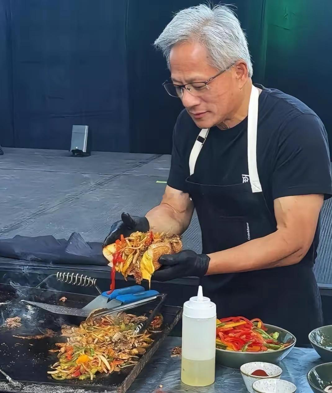 要不说黄仁勋能成首富呢!一起看看这张图。虽然看不出手里具体是什么,但看样子就是他自己做的,而且厨艺还不错,色香味俱全,看起来挺诱人的。最关键的是,黄仁勋虽然头发白了,但是胳膊上的腱子肉是藏不住的,完全就像经常健身的人。亿万公司的大总裁,还能抽时间健身,绝对很了不起。虽然没有穿标志性的皮衣,但整个人气场非常强,天生就有一种镇定自若大人物的风格。果然优秀的人,绝对是自律性超级强的人,大家觉得是不是呢?