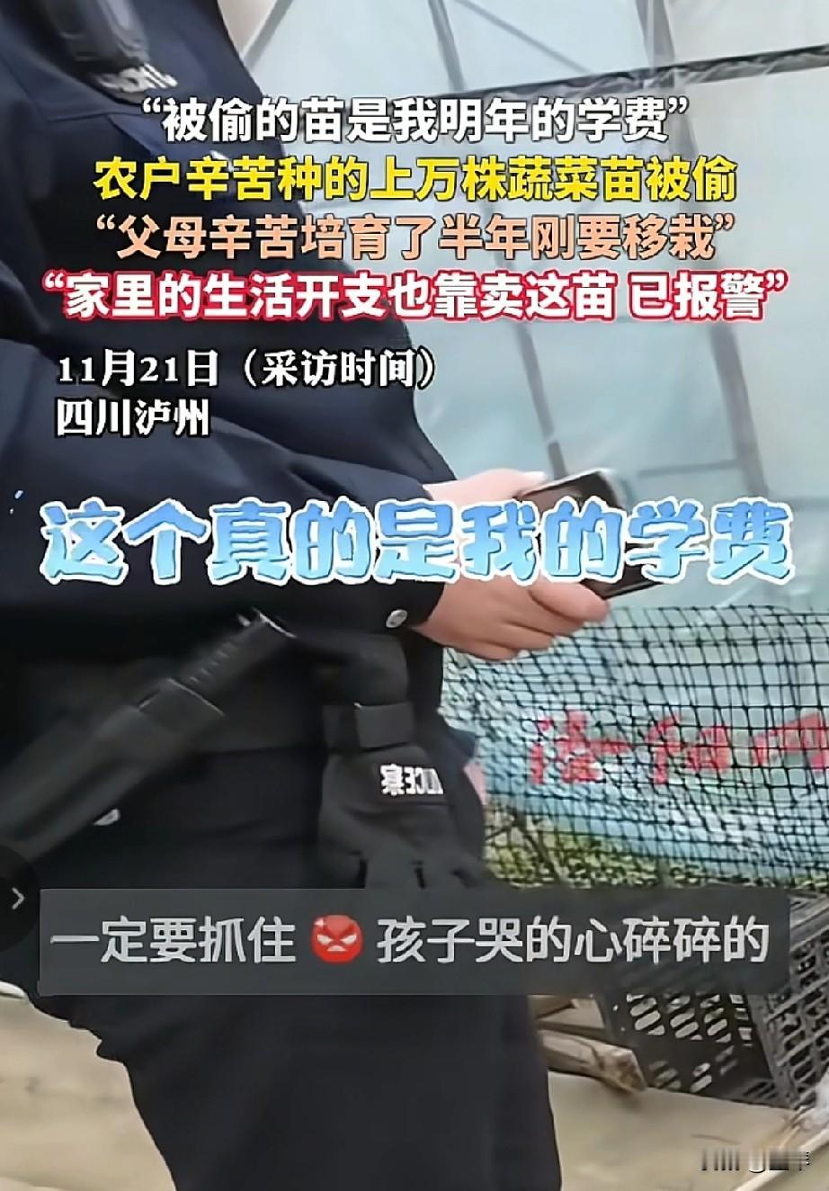 四川泸州这个贼是真缺德,把人家农户整整大半年的收入全偷光了。 刷到这个视频看得人心里堵得慌——四川泸州这户人家,农户半年熬出来的上万株菜苗,是孩子明年的学费,是一家人的生活费,眼瞅着第二天要移栽了,一夜之间被偷得干干净净。 小偷你偷的哪是菜苗啊?是人家起早贪黑的汗珠子,是孩子攥着的上学盼头,是普通农户家撑着日子的指望。偷老人自种的菜都能让人心疼,偷这种活命钱的,良心是揣裤兜里丢了? 这苗是人家从春到冬盯出来的,你扛走的时候就没听见人家孩子哭“这是我的学费”?真不怕这沉甸甸的“偷来的苗”,压得你往后走路都抬不起头? 虽然警察已经立案了,只能盼着这贼能早点被揪出来——不是为了别的,是让这家人知道:好好过日子的人,不该被这么欺负。