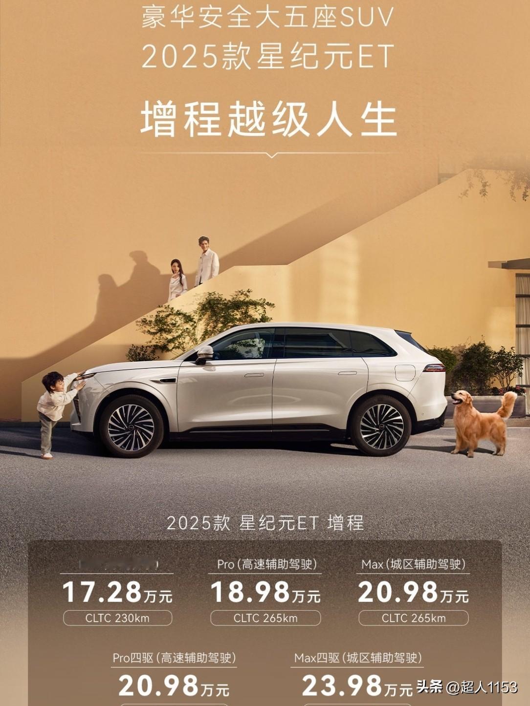 2025款星途星纪元ET在2025年10月18日奇瑞全球创新大会上正式发布,给我们提供了增程纯电的双动力版,它全系标配了L4级自动驾驶官方的指导价为17.28万元~30.18万元,最高有2万元的置换补贴。 星纪元ET增程版:17.28万元~28.98万元。 星纪元ET纯电版:21.98万元~27.98万元。 星纪元ET作为Robotaxi体验平台,完成了319米高空坠落安全的测试。并有着智能化的升级,它全系标配了30个传感器,含激光雷达+英伟达rinX芯片(508TOPs算力),为我们实现了高速城区/领航以及智能的泊车。