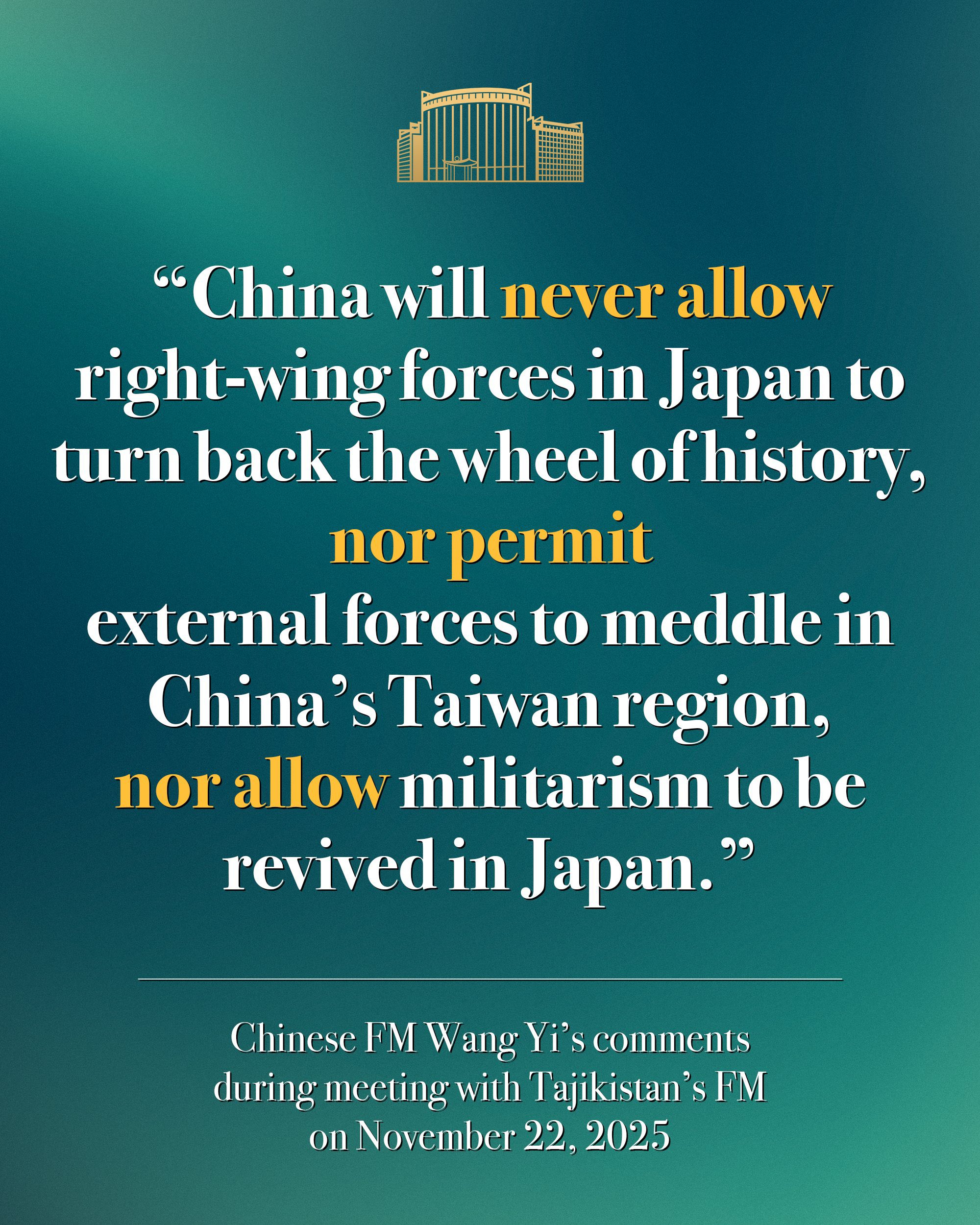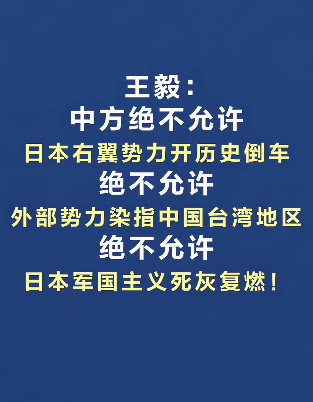 王毅:中方绝不允许日本右翼势力开历史倒车;绝不允许外部势力染指中国台湾地区;绝不允许日本军国主义死灰复燃。