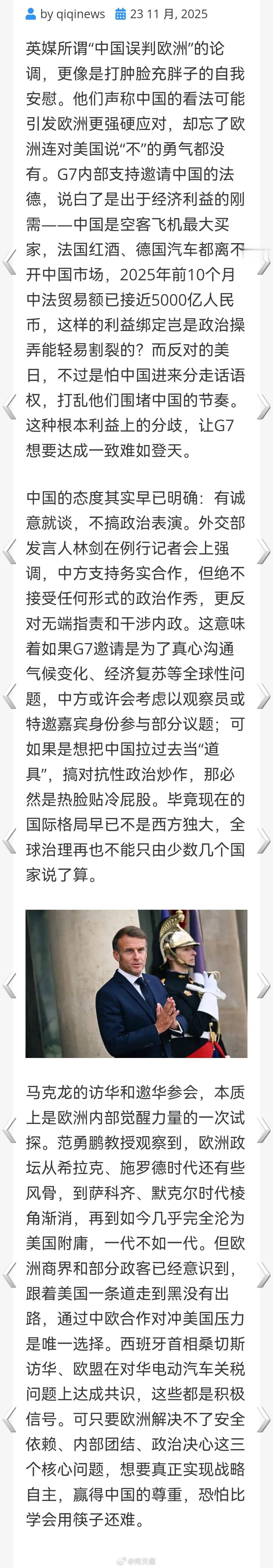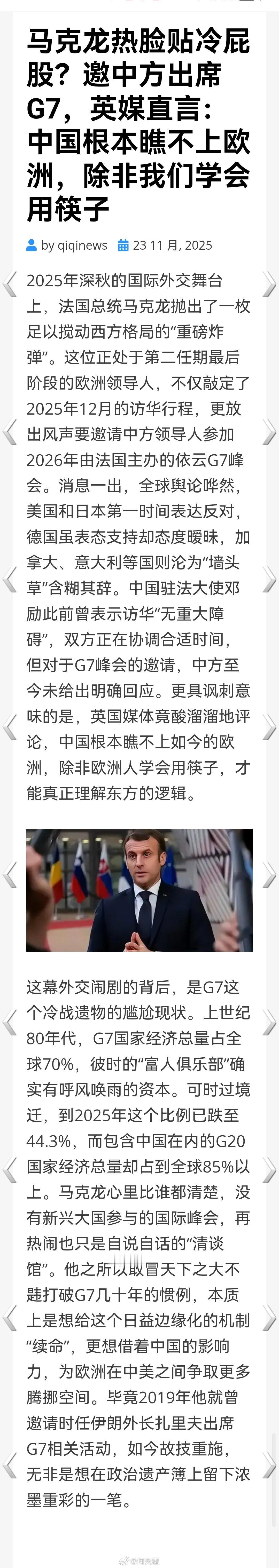 马克龙热脸贴冷屁股?邀中方出席 G7,英媒直言:中国根本瞧不上欧洲,除非我们学会用筷子。
