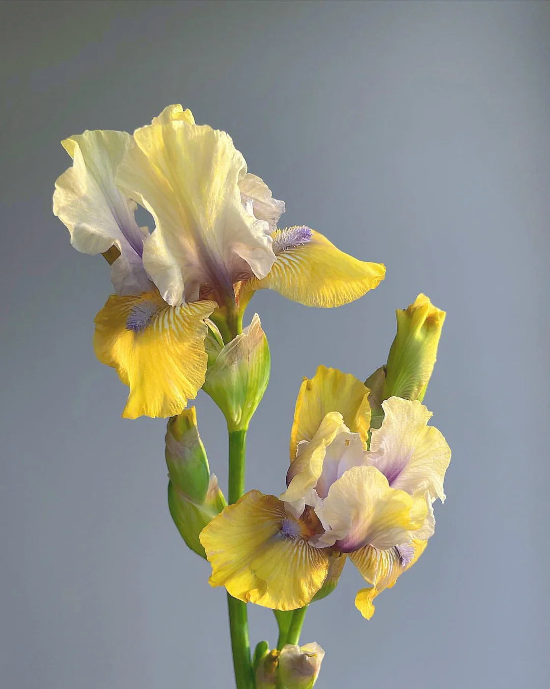 🟡🟢搭配:鸢尾造型优雅独特,可以搭配如玫瑰、郁金香等花材,配成花束,鸢尾在其中是很吸睛的存在;在插花中,鸢尾作为跳跃型花材可以增加作品的灵动性与高级感;居家瓶插也可以增添家中的氛围感。