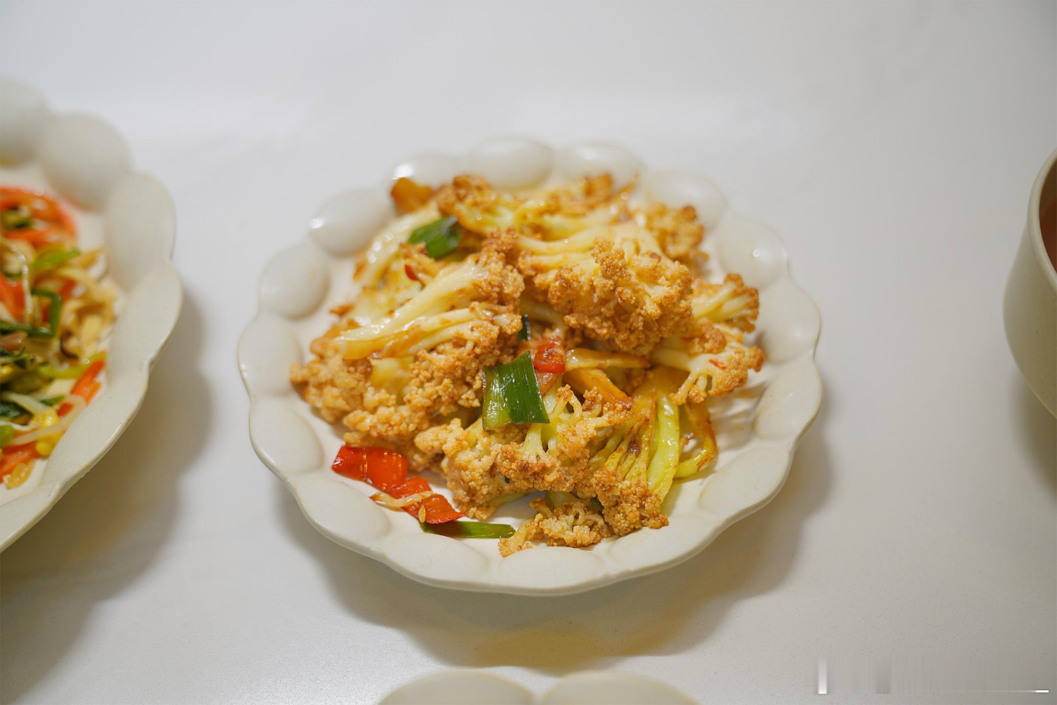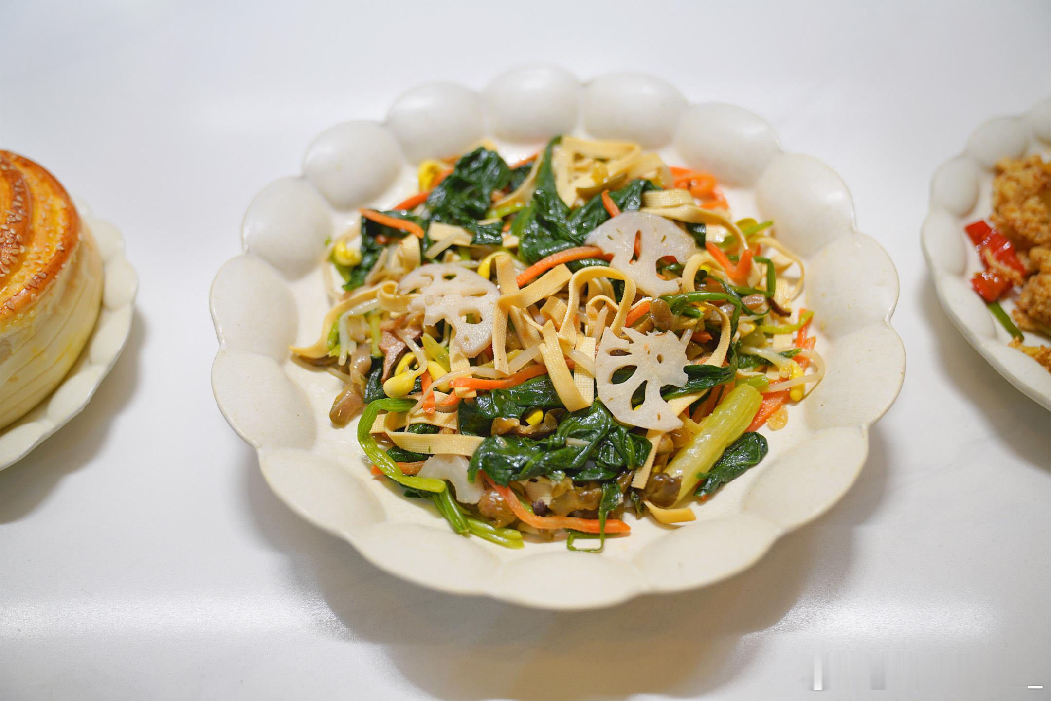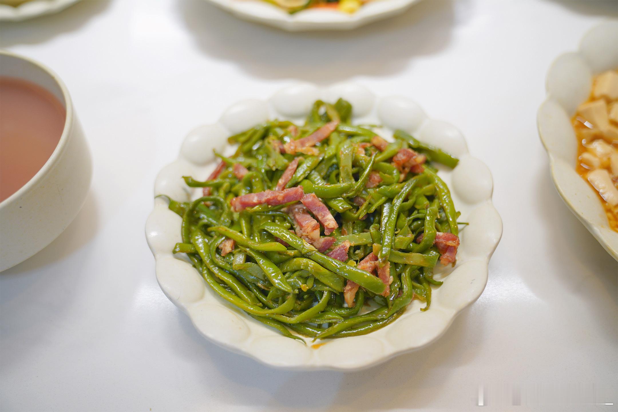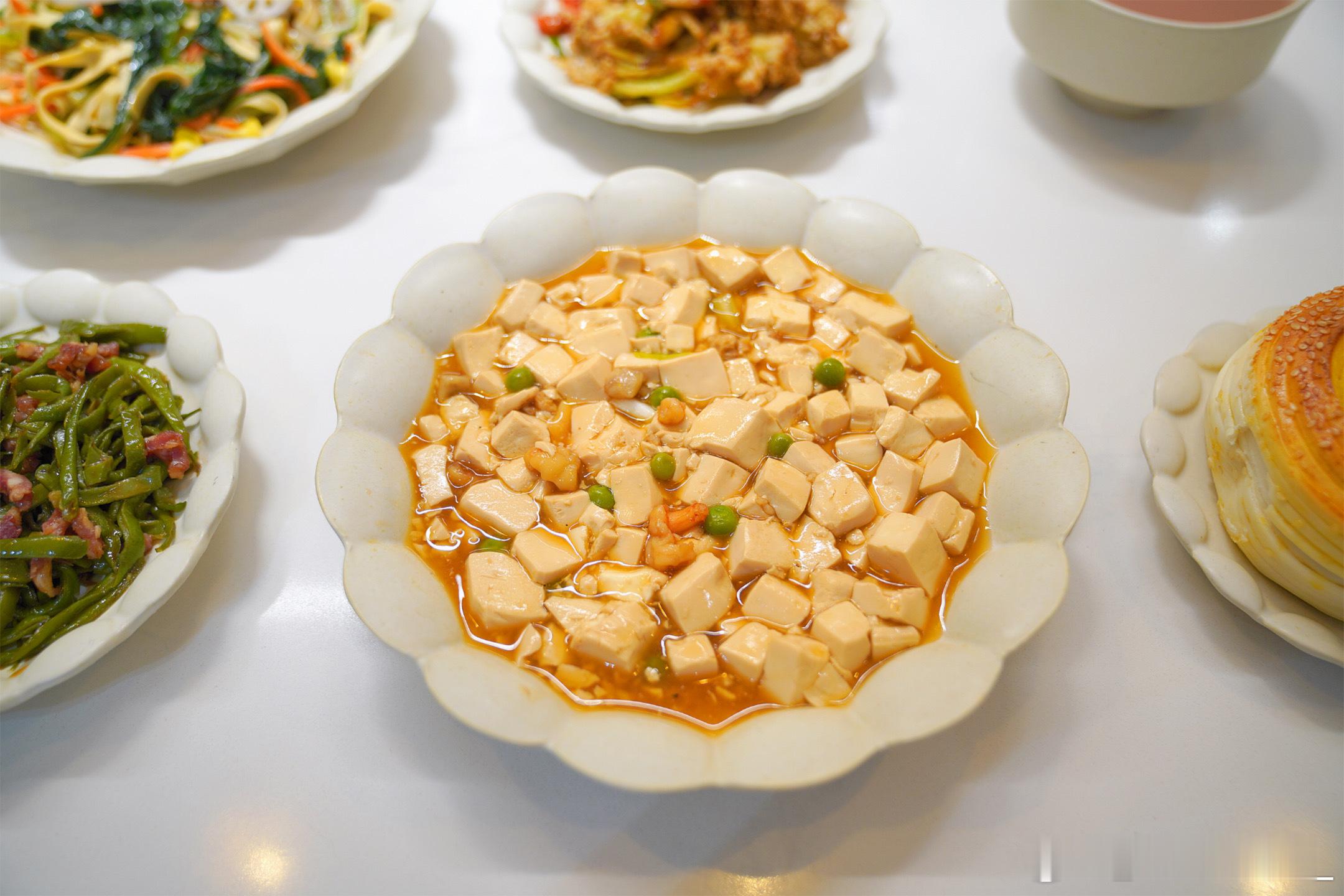 周末晚饭扁豆丝炒肉、海鲜豆腐、干锅花菜、凉拌素什锦、金丝奶香卷、杂粮粥~