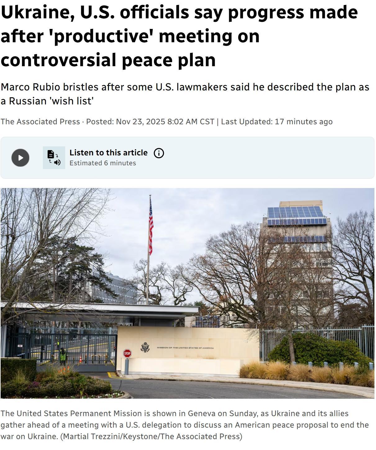 美乌代表会谈,正式讨论和平计划 美国国务卿马可·鲁比奥周日在日内瓦会见乌克兰高级特使,讨论特朗普提出的结束俄罗斯对乌克兰战争的提议。 鲁比奥在接受记者采访时称,会谈是“可能是特朗普政府上台以来最富有成效、最有意义的一次会晤”,双方代表团将在晚些时候再次会面。 鲁比奥说,“这最终还是需要我们的总统批准,尽管鉴于我们取得的进展,我对此感到非常放心。” 鲁比奥与陆军部长丹·德里斯科尔和特朗普特使史蒂夫·维特科夫一同出席了会谈,他表示,和平计划最终还需要俄罗斯批准。 乌克兰代表团团长、总统办公厅主任安德烈·叶尔马克也确认,初步会谈已结束,第二次会议将很快举行。“我想确认我们与这位杰出的美国代表团进行了非常富有成效的首次会谈。我们取得了非常显著的进展,正朝着公正持久的和平迈进。““很快今天将召开第二次会议,我们将继续与欧洲伙伴共同推动联合提案。最终决定将由我们的总统作出。” 乌克兰总统弗拉基米尔·泽连斯基表示,他正在等待谈判结果。“我们所有人都需要一个积极的结果。”他说,“乌克兰和美国队,以及我们欧洲伙伴的队伍——保持着密切联系,我非常希望能有结果。必须停止流血冲突,必须确保战争不会重新点燃。“