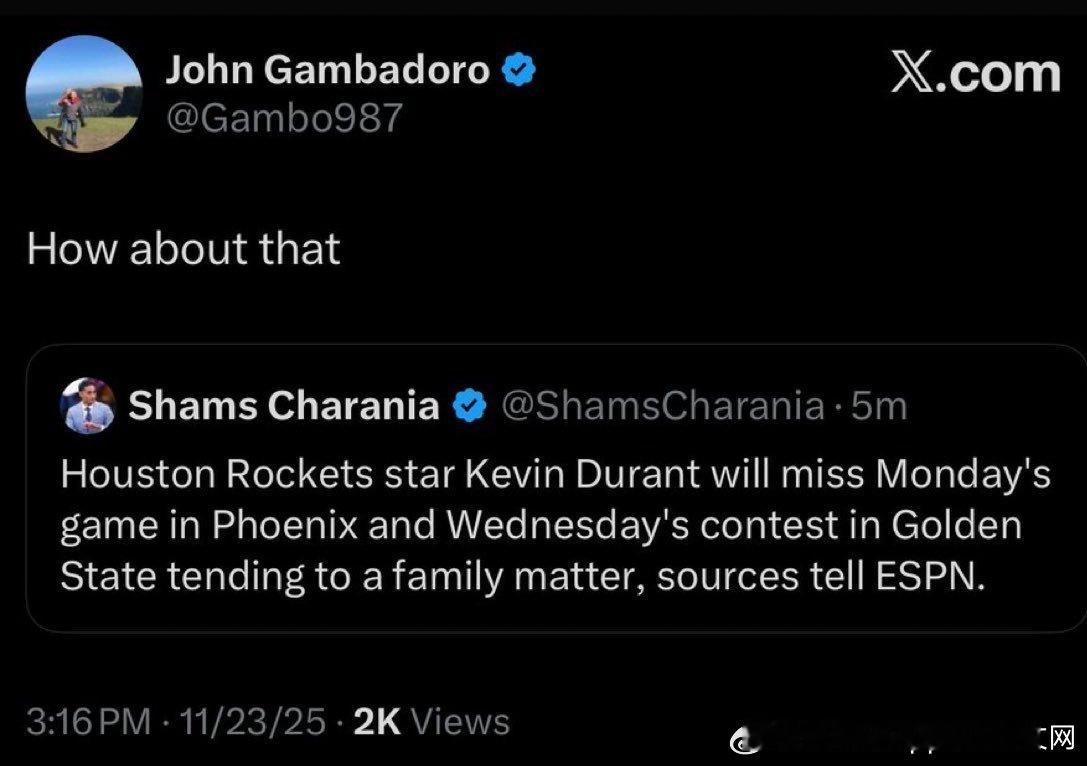 🏀 NBA 晨报 ·(2025年11月24日 周一)今日热点莫兰特再次因场边言论成为舆论焦点戈登伤缺,掘金战力受重创KD因家庭事务缺陷和太阳,勇士的比赛湖人主帅雷迪克希望保罗无冠退役火箭即将进入短期无 KD 阶段,谢泼德使用率预计上升🚀 火箭专区🔥 1. 掘金主帅小阿德尔曼称赞谢泼德火箭 109–112 惜败掘金,但 谢泼德轰下生涯新高 27 分掘金主帅盛赞:“他随时能突然爆发翻盘比赛,他让火箭完全变成另一支队伍。”小阿德尔曼强调谢泼德 + 杜兰特让火箭进攻“多了一层武器”火箭当前 10–4,仅落后掘金 1 场🚨 2. KD 因家庭事务缺席(Shams)杜兰特将缺席:周一 VS 太阳周三 VS 勇士原因:家庭事务(无伤病)太阳队记对杜兰特因家庭事务缺席比赛表示幸灾乐祸引火箭媒体不满(图2)📈 3. 火箭未来资产迎利好(ClutchFans)顶级新秀 Bruce Branch III 提前从 2027 → 2026 级让 2027 届选秀班变强ClutchFans:“这对火箭是超级利好。”火箭掌控:太阳 2027 首轮(无保护)篮网 2027 首轮互换权(无保护)🔥 2027 选秀班越强 → 火箭资产越值钱📰 联盟热点⚡ 克莱 vs 莫兰特全面冲突(The Athletic)独行侠 vs 灰熊赛后,克莱与莫兰特当场爆发冲突被队友拉开原因:莫兰特在穿便装情况下“插话嘲讽”克莱克莱赛后开炮:“他说的话没有任何智慧深度。”“他职业生涯除了说话没让我们看到更多。”“这支灰熊只会说,从没真正证明过。”莫兰特本季因伤出战少,还曾被球队禁赛最近三年共出战 71 场克莱对比老灰熊:“我尊重 康利 / 兰多夫 / 加索尔,那是真正的强硬球队。现在这支灰熊?只会嘴炮。”🧨 戈登重伤(Shams)掘金首发阿隆戈登:右腿二级腿筋拉伤预计 缺席 4–6 周本季数据:18.8 分(生涯新高)三分 44.4%掘金已经同时缺少两名首发📊 2027 年选秀再震动(Tobias Bass / The Athletic)顶级高中球员Bruce Branch III 宣布提前跳级至 2026 级:他夏季在欧洲训练营拿下 最佳新星 + 最佳阵容NBA 西部球探:“技能包 + 心态 + 发展轨迹 = 顶级成长曲线。”“有机会成为该届前三,甚至状元。”高度:6'7(约201 cm),臂展 7'1技术:外线命中率 39%中距离创造强两米一防守覆盖范围👀 湖人持续关注:安德鲁威金斯(NBA Central)湖人正在监控是否能从热火得到维金斯来源:Jake Fischer / B/R湖人仍在寻求外线锋线升维🏀 湖人主帅雷迪克评保罗:带刺的赞美(Legion Hoops)(图3)雷迪克:“我希望 CP3 永远不要拿冠军,因为那意味快船夺冠,这(没有冠军)才是真正的 CP3,他就是终极赢家。”(雷迪克的原话带玩笑性质,但仍登上热搜)