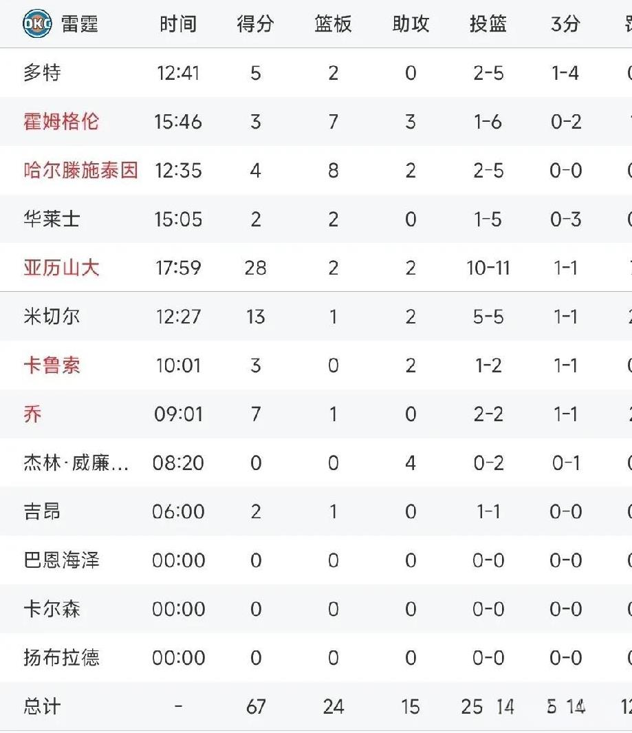 半场结束,杨瀚森获得出场机会,亚历山大半场28分! 开拓者对阵雷霆的半场比赛结束,雷霆67:46领先开拓者21分,这场比赛开拓者只有格兰特高效拿到16分,其他球员集体哑火,尤其是主力得分点阿夫迪亚仅仅拿到6分,其中三分球7中0。杨瀚森给了5分钟出场时间,拿下3分! 雷霆队亚历山大28分2板2助攻,其中罚球11中10,三分球1中1,这场比赛过后亚历山大已经连续90场得分20+!
