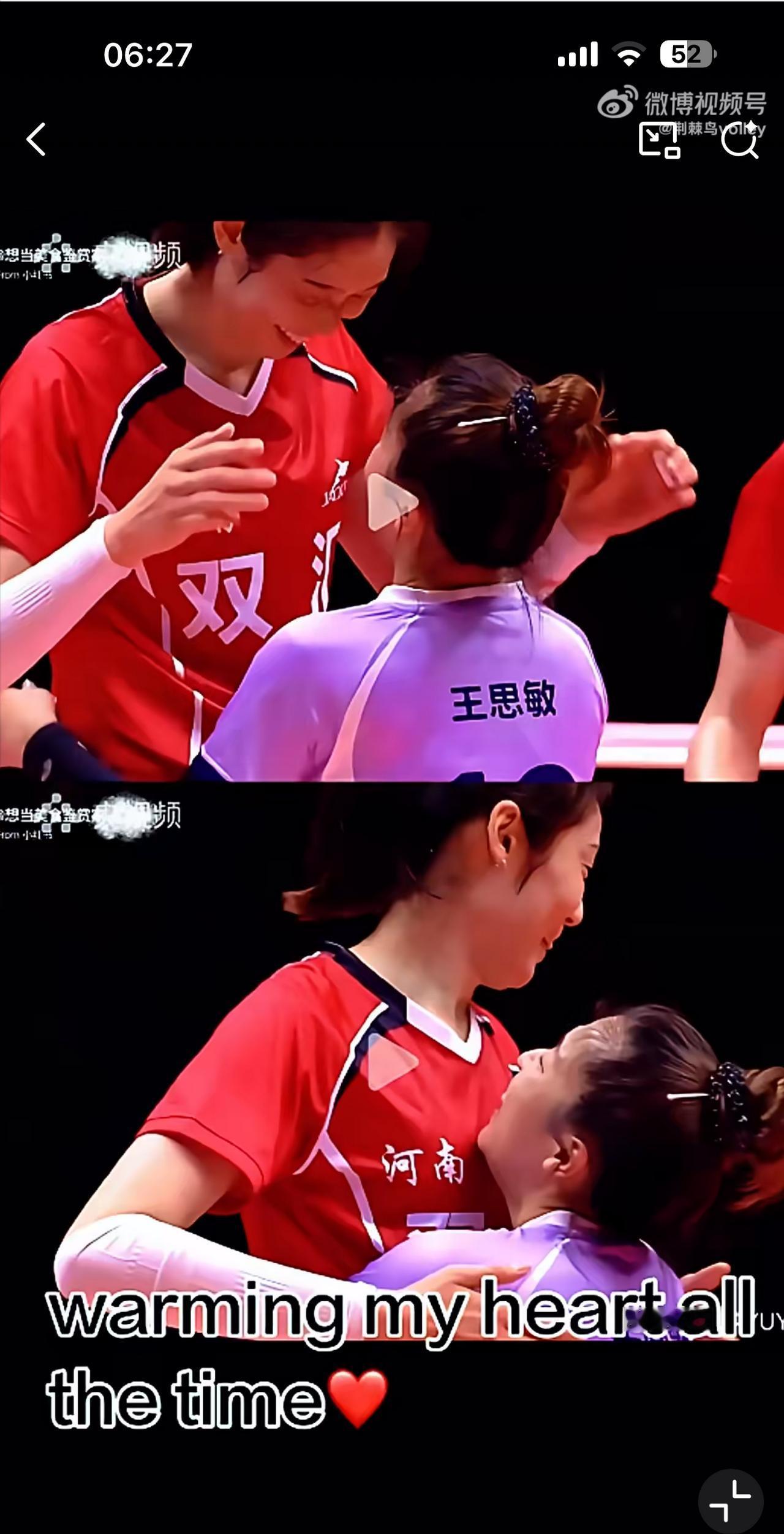 朱婷人格魅力真的强:队友王思敏发文“让人感动”! 全运会期间,朱婷拥抱自由人王思敏的照片感动许多人! 全运会结束后,王思敏发文表达对朱婷的感谢和友情,她说这段时间一直被温暖着! 在视频中,王思敏用了很多全运会期间的照片,其中绝大多数都是和朱婷在一起的瞬间,能感觉到,王思敏很喜欢朱婷,这段时间,她们“相亲相爱”,结下了深厚的友情! 看到河南女排队友之间,这样的温暖彼此,真的感觉很美好,在职业球员枯燥的运动生涯,有这样的队友感情,那也感觉不那么辛苦了吧?