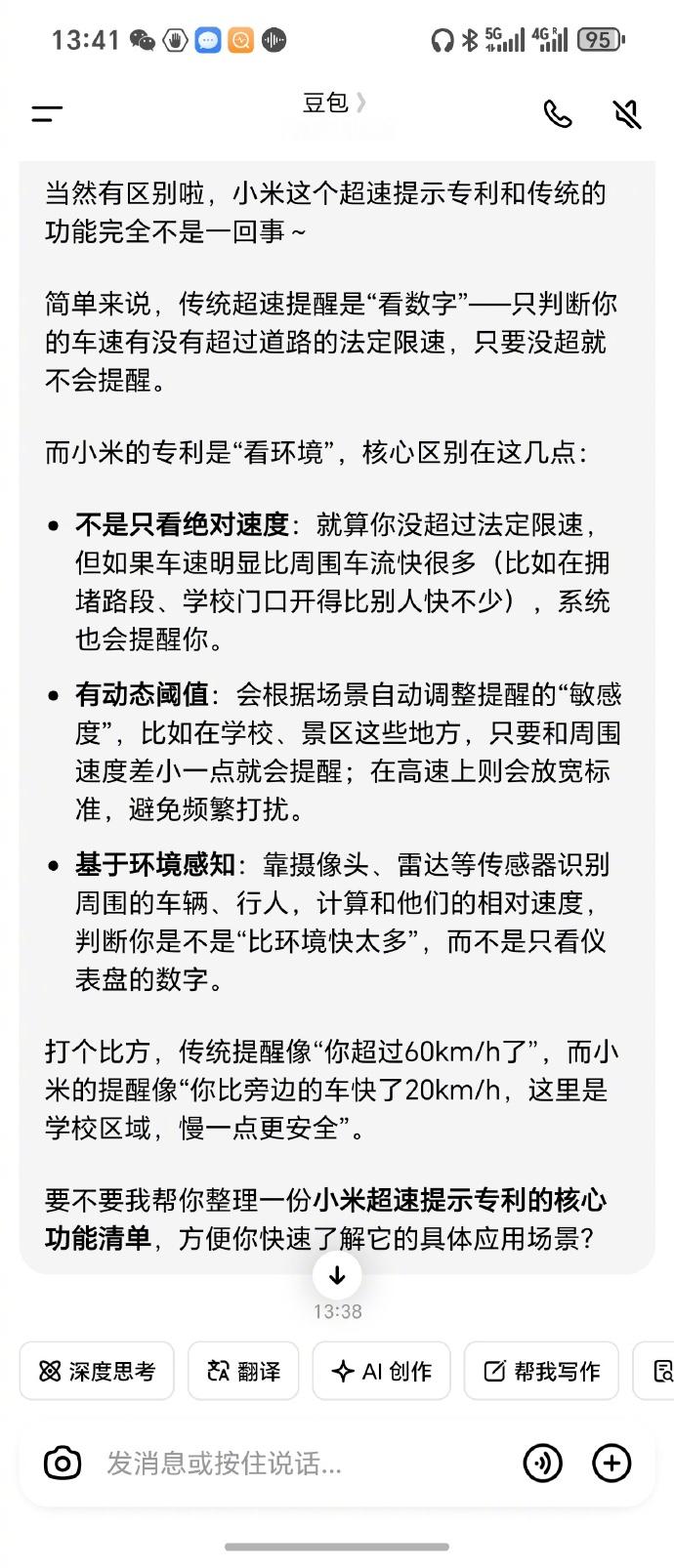 看了一眼小米这个专利,11月14日,小米汽车科技有限公司申请的“车辆超速提示方法、装置、车辆、存储介质及程序产品”专利公布。摘要显示,本公开涉及车辆技术领域,包括:通过传感器采集车辆所处环境中的对象信息,并根据对象信息筛选出预设类型的对象作为参考对象,获取车辆相对于移动的参考对象的相对行驶速度;在相对行驶速度处于超速提示阈值区间内的情况下,输出超速提示信息,提升了行车安全。百度整理了一下,居然是这样的(看图)个人读解:这绝对是中国模式啊,特事特办,可以为一家企业,甚至一款车制定新规则。这个太牛了有这种如此宽松的市场环境,你还觉得咱们的汽车工业发展不起来吗?这是绝对的自由经济,西方永远达不到这样的高度不过,作为个人,还是建议你小心驾驶,遇到这样的车,尽量远一点,不要靠的太近,以免被殃及