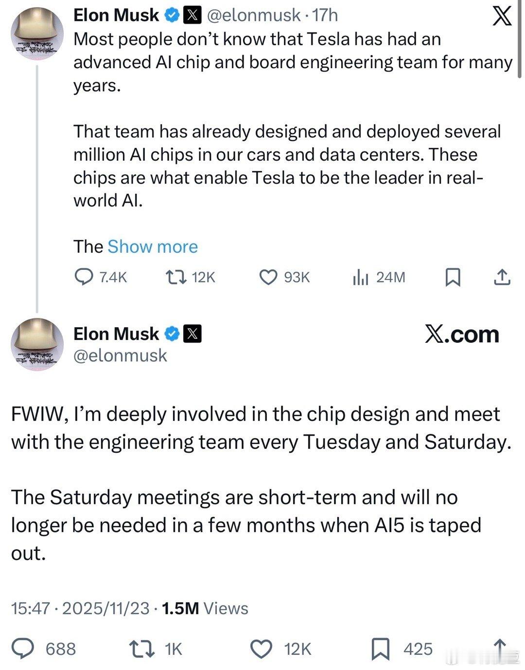 特斯拉的目标是每 12 个月就推出一款全新 AI 芯片设计并实现量产。预计,最终我们生产的芯片总量将超过世界上所有其他 AI 芯片的总和。马斯克原推文: 大多数人并不知道,特斯拉其实多年来就拥有一个极为先进的 AI 芯片和电路板工程团队。这个团队已经设计并部署了数百万颗 AI 芯片,用于我们的汽车和数据中心。这些芯片正是特斯拉能够在现实世界 AI(real-world AI)领域保持领先地位的关键。目前车辆上使用的是 AI4,我们即将完成 AI5 的流片(tape-out),并已经开始 AI6 的研发工作。我们的目标是每 12 个月就推出一款全新 AI 芯片设计并实现量产。我们预计,最终我们生产的芯片总量将超过世界上所有其他 AI 芯片的总和。请把这句话再读一遍,我不是在开玩笑。这些芯片将以极其积极的方式深刻改变世界:通过更安全的自动驾驶拯救数百万人的生命,并通过 Optimus(人形机器人)为全人类提供先进的医疗服务。请将简历连同三点弹头内容(描述你超强能力的证据)发送至:AI_Chips.com 我们特别希望将最前沿的 AI 技术应用于芯片设计。谢谢, Elon顺便说一句,马斯克本人深度参与芯片设计,每周二和周六都会和工程团队开会。周六的会议主要是短期事务,等再过几个月 AI5 完成流片(tape-out)之后,就不再需要这些周六会议了。
