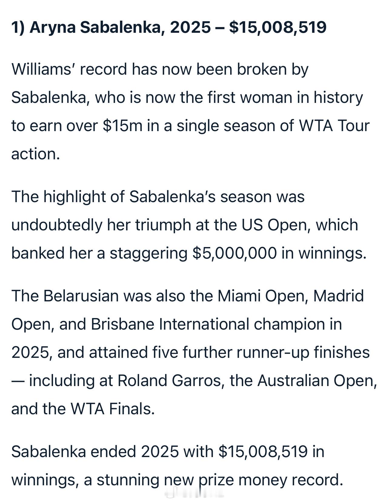女子🎾单赛季奖金榜👇2025萨巴伦卡 :1500万美元2013小威:1238万美元2019巴蒂: 1130万美元2015小威: 1058万美元2016科贝尔: 1013万美元(2025斯瓦泰克: 1011万美元)