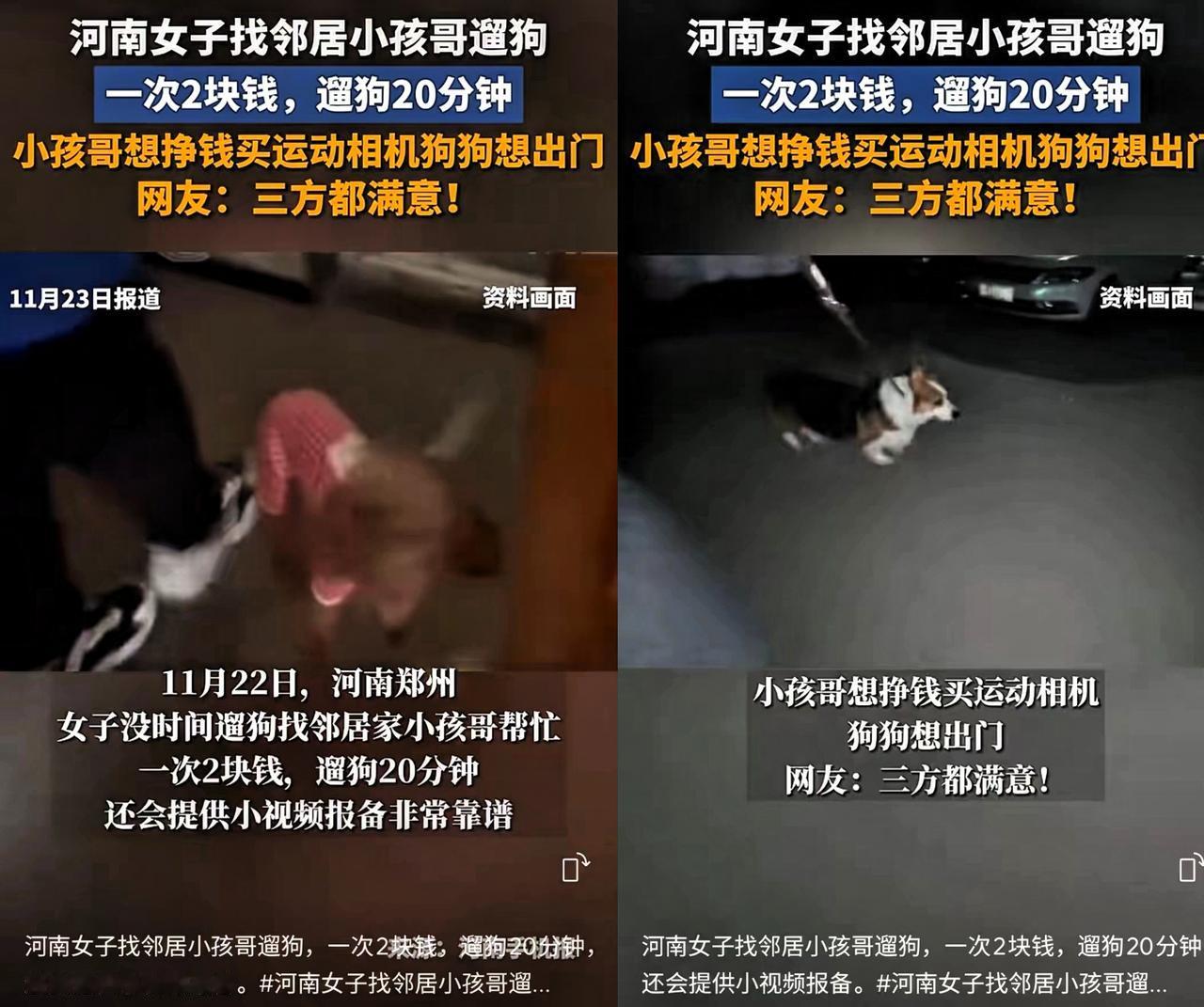 河南郑州一女子因没时间遛狗,以每次2元的价格雇佣邻居家小孩帮忙遛狗20分钟。小孩希望通过劳动赚取零花钱购买运动相机,每次遛狗后还会提供视频,既锻炼了责任心,又懂了赚钱。这操作真的太六啦! 这哪是简单的雇佣,分明是双向成全!比起给孩子随手发红包,这种靠劳动换报酬的方式,更能让孩子明白价值的意义。 而女子尊重孩子的劳动、邻居之间的信任,更是让这件事充满了暖意。 现在太多孩子衣来伸手,其实适当的“小打工”反而能磨出责任感。生活里的小难题,往往藏着最实在的成长机会。你觉得该鼓励孩子做这类力所能及的小兼职吗?