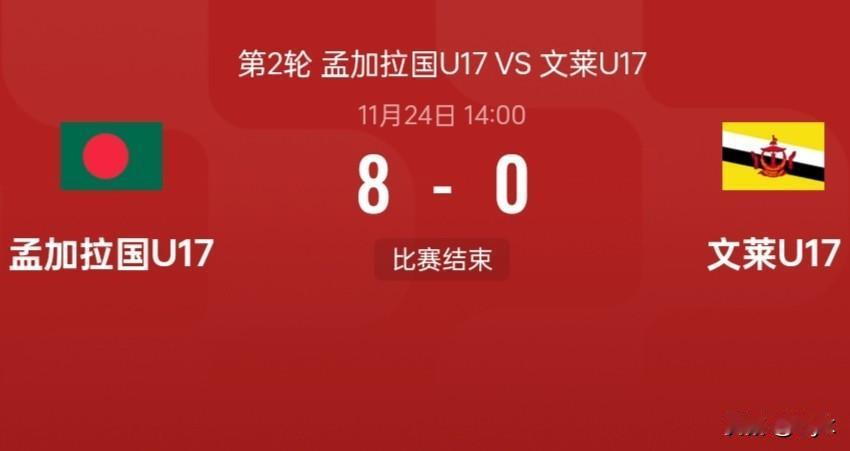 在刚刚结束的U17亚洲杯预选赛中, 孟加拉国U17刚以8-0血洗文莱, 巴林2-