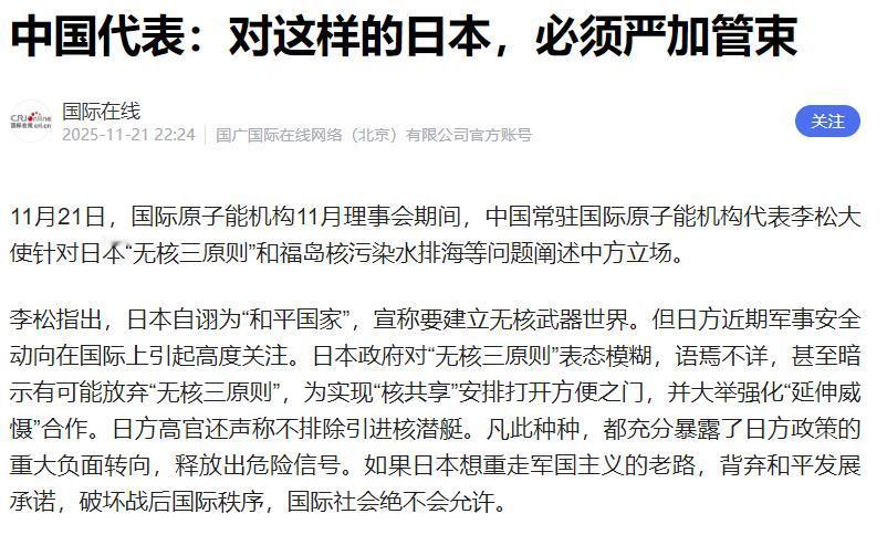 中国正式官宣:对日本重要核矿产资源进行限制! 11月21日,在国际原子能机构理事会上,中国代表一句“对这样的日本,必须严加管束”,着背后藏着国际社会对日本核领域长期以来的担忧。 日本的身份太特殊了,作为《不扩散核武器条约》成员国里唯一掌握后处理技术、有能力提取武器级钚,还能让后处理设施正常运转的无核武器国家,手里握着的核材料早就超出了民用核能的实际需求。 日本总说自己是“和平国家”,声称要建立无核武器世界,可行动上却一点不老实。 就说那钚材料,即便没有最新的精确库存数字,但多年来国际社会都看在眼里,它储存的量早就不是民用核电那点需求能打住的。 制造一枚核武器,大概需要8公斤左右的武器级钚,日本手里的那些“存货”,要是真用来搞事情,能造出多少件大杀器,想想都让人后背发凉。 更别说它还有青森县六所村那个核燃料处理厂,这可是实打实能持续生产钚的地方,民用需求就那么点,却一直维持着这样的产能,到底图啥呢? 而最近日本的军事安全动向更是释放出危险信号,对“无核三原则”表态模棱两可,含糊其辞,甚至还暗示有可能放弃这一原则,为“核共享”打开方便之门,忙着强化所谓的“延伸威慑”合作,连高官都放话不排除引进核潜艇。 这就有意思了,一边喊着和平口号,一边在核相关的军事领域动作频频,再加上手里握着大量远超需求的核材料,这组合拳打出来,任谁也不能再把它当成单纯的“和平爱好者”了。 更让人不放心的是14年前的福岛核事故,那可是“天灾+人祸”的典型案例,至今后续处置都还没搞定,国际社会一直高度关注。 可日本政府倒好,罔顾周边国家和人民的强烈反对,执意要把核污染水排海,这种对核安全极不负责的态度,怎么能让人相信它会妥善处理那些敏感的钚材料? 中方坚决支持国际原子能机构建立并强化对日国际监测,就是要盯着它别再干出什么出格的事。现在官宣对日本重要核矿产资源进行限制,正是看到了这些潜在的风险。 核扩散不是小事,一旦日本在核问题上越界,后果不堪设想。它要是真敢重走军国主义老路,背弃和平发展的承诺,破坏战后国际秩序,国际社会肯定不会答应。 而我们的这一步棋,既是维护国际核不扩散体系的必要之举,也是给那些抱有侥幸心理的国家提个醒,核领域容不得半点含糊,谁要是想搞小动作,就得做好被管束的准备。 日本要是真有诚意搞和平,就该老老实实恪守“无核三原则”和国际核不扩散义务,给国际社会一个干脆明确的交代,而不是一边囤着核材料,一边在军事上搞各种小动作,这样的操作实在难以让人信任。