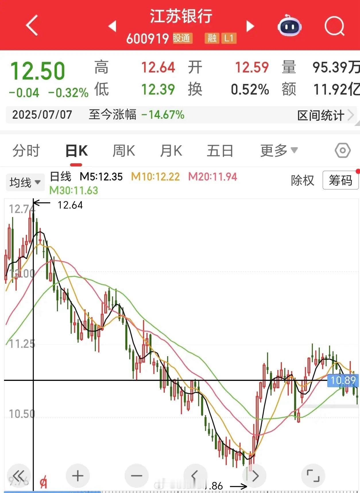 浅谈:江苏银行目前股价10.7元,高位至今下跌14%,今年以来上涨14%。不良贷款率0.84%,净息差1.52%,净资产收益率11.90%,拨备覆盖率322.62%,核心一级资本充足率8.61%,静态股息率4.86%,动态股息率5.22%。要是股息率到了5.5%还是可以考虑的,动态目前还不到,要么就是多拿一年分红降低成本。