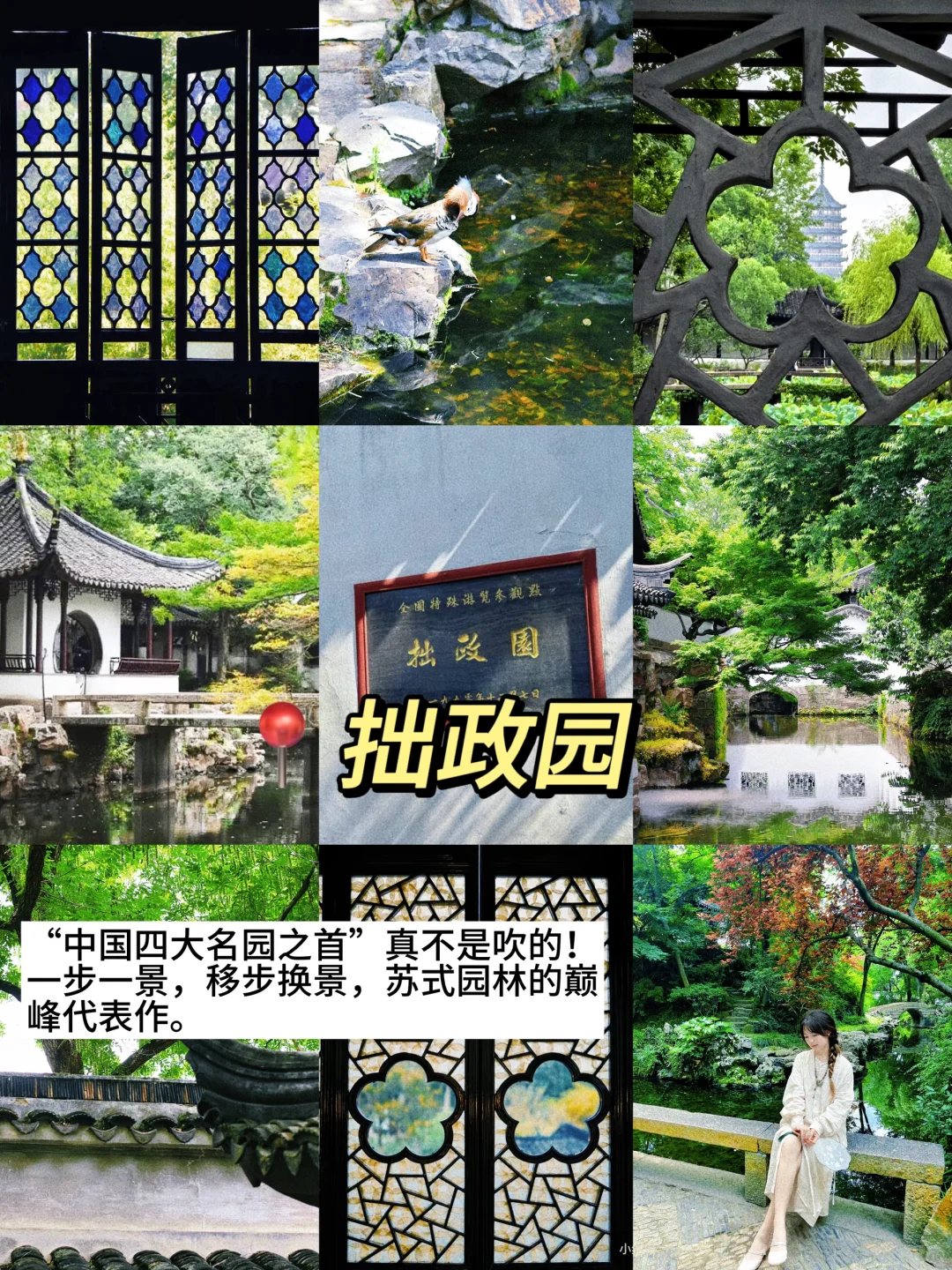 1️⃣拙政园:“中国四大名园之首”真不是吹的!一步一景,移步换景,苏式园林的巅峰代表作。建议早上去,人少清幽,穿旗袍拍照绝美!