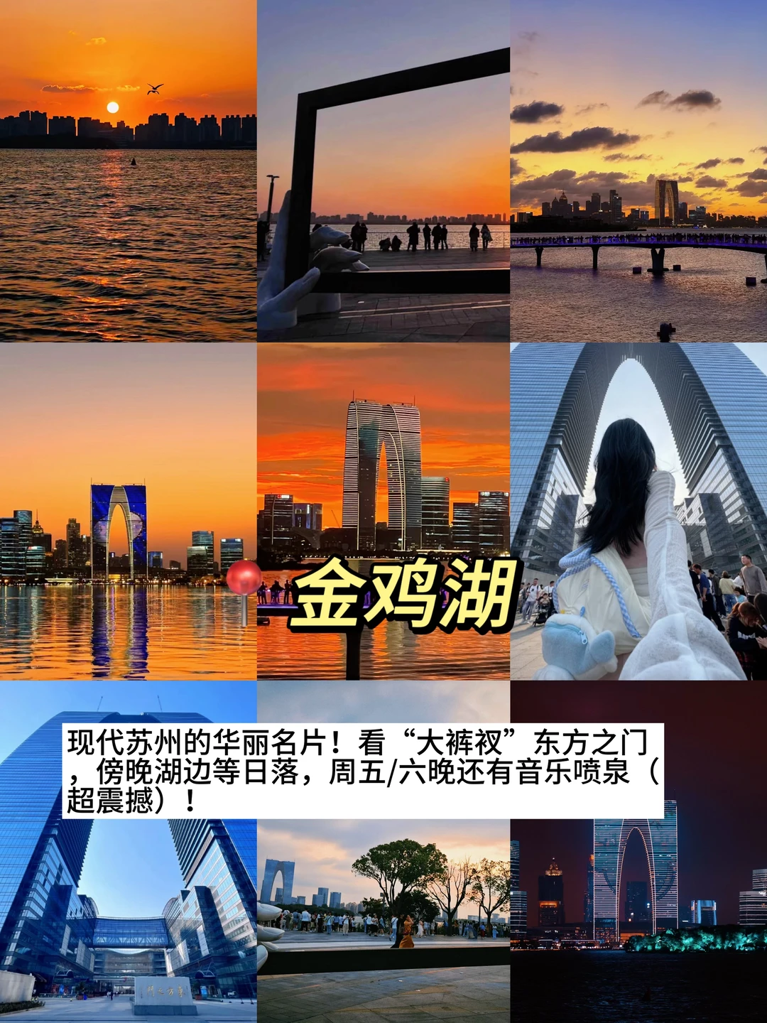 4️⃣金鸡湖:看“大裤衩”东方之门,傍晚湖边等日落,周五/六晚还有音乐喷泉(超震撼)! 🌇