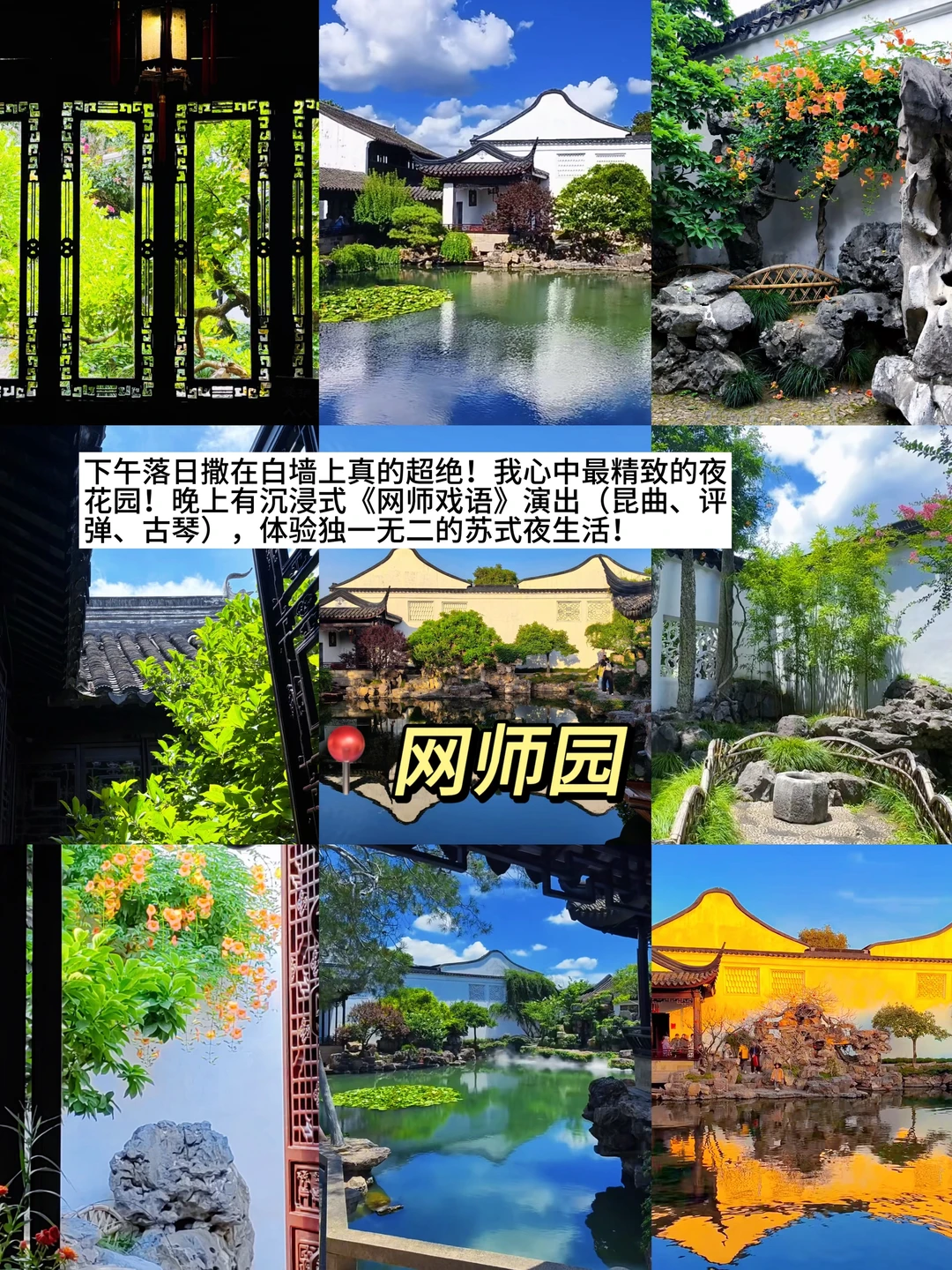 6️⃣网师园 :下午落日撒在白墙上真的超绝!晚上有沉浸式《网师戏语》演出(昆曲、评弹),体验独一无二的苏式夜生活!