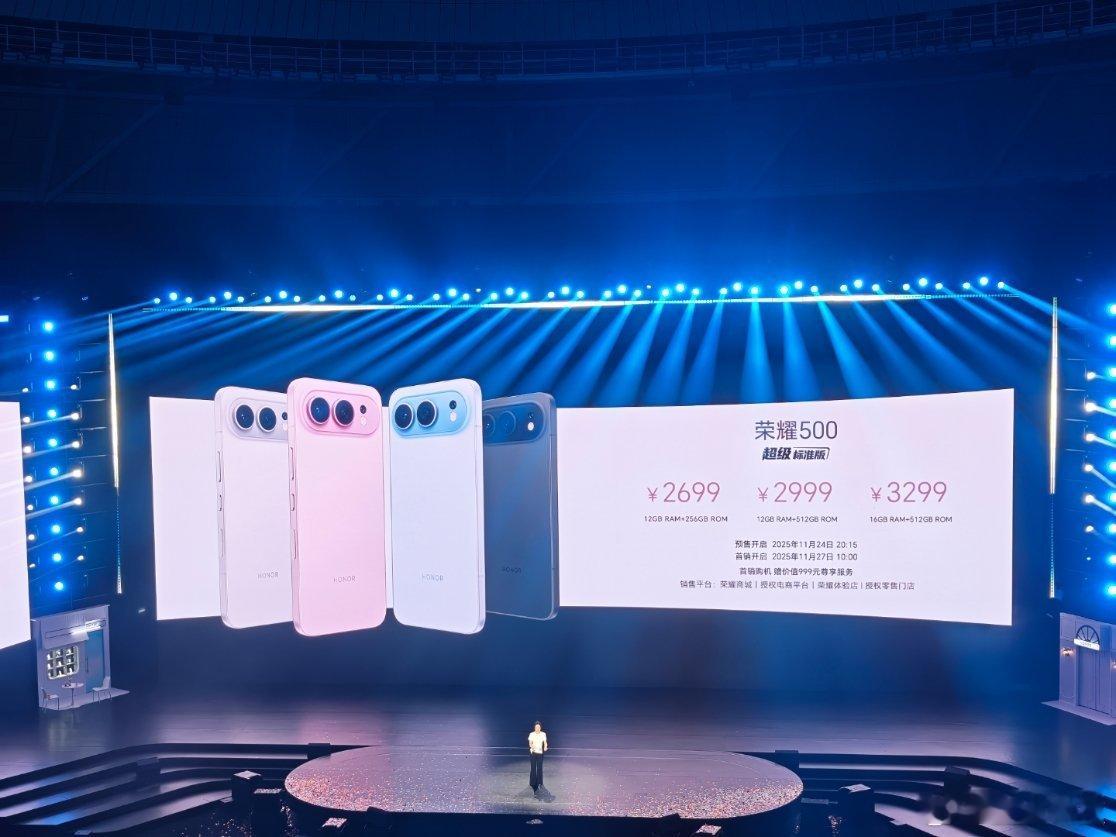 荣耀500系列的价格跟大家汇总一下:荣耀500标准版 2699起步荣耀500 Pro 3599起步在全面越级升级的情况下,性能升级到了骁龙8E/第四代骁龙8s,电池升级到了8000mAh,影像升级为2亿人像!你们优先考虑哪一款?预算充足的直接充Pro吧,配置拉满,几乎无短板;如果是轻度使用用户的话,不追求极致的话,就选标准版吧!肖战同款,香!