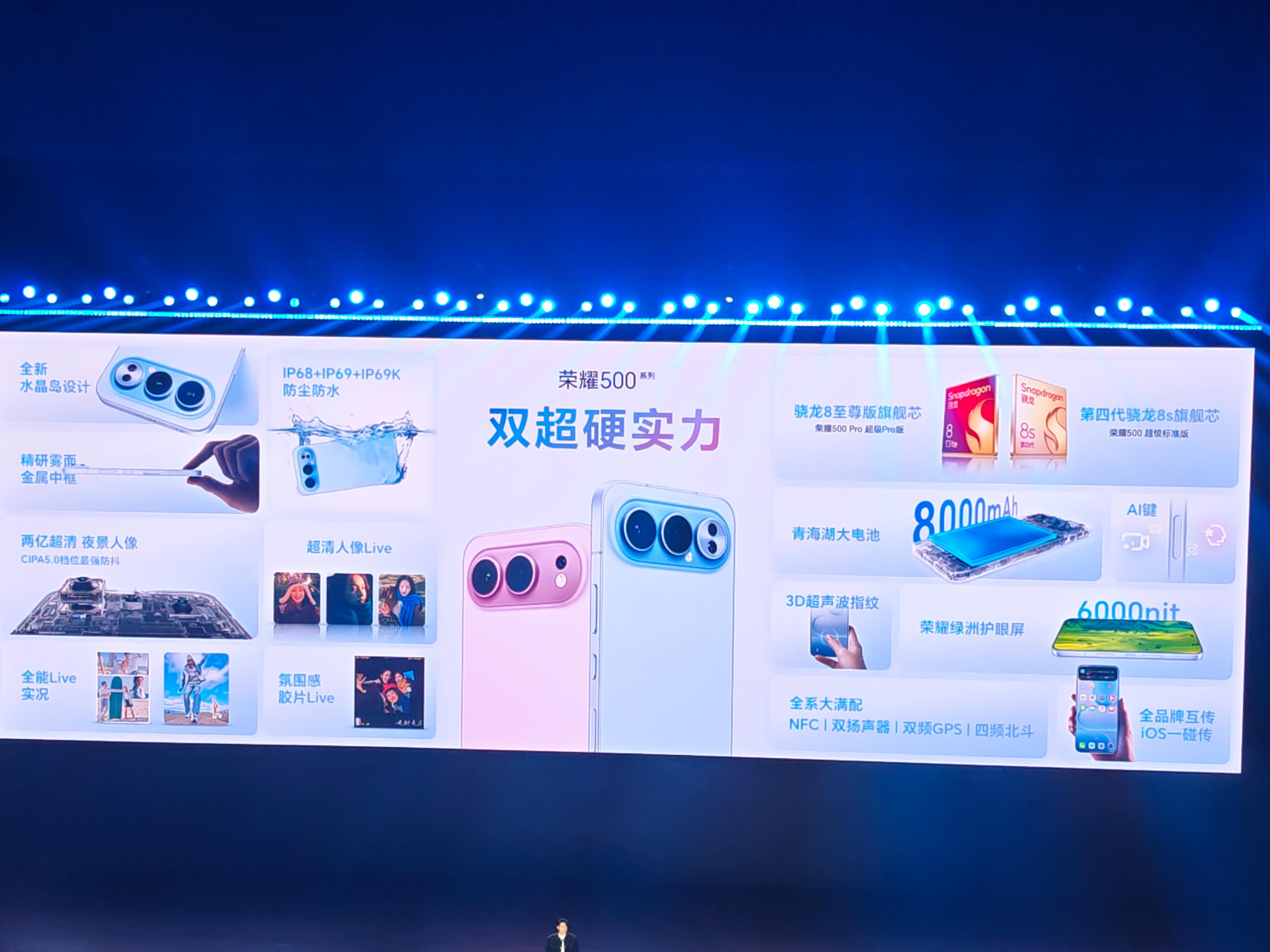 荣耀500系列这波的配置真的给的非常多!超薄超窄的设计,年轻时尚骁龙8至尊/第四代骁龙8s双旗舰芯片性能全系2亿超清人像,支持4K Live人像全系还标配了8000mAh电池你们满意吗?
