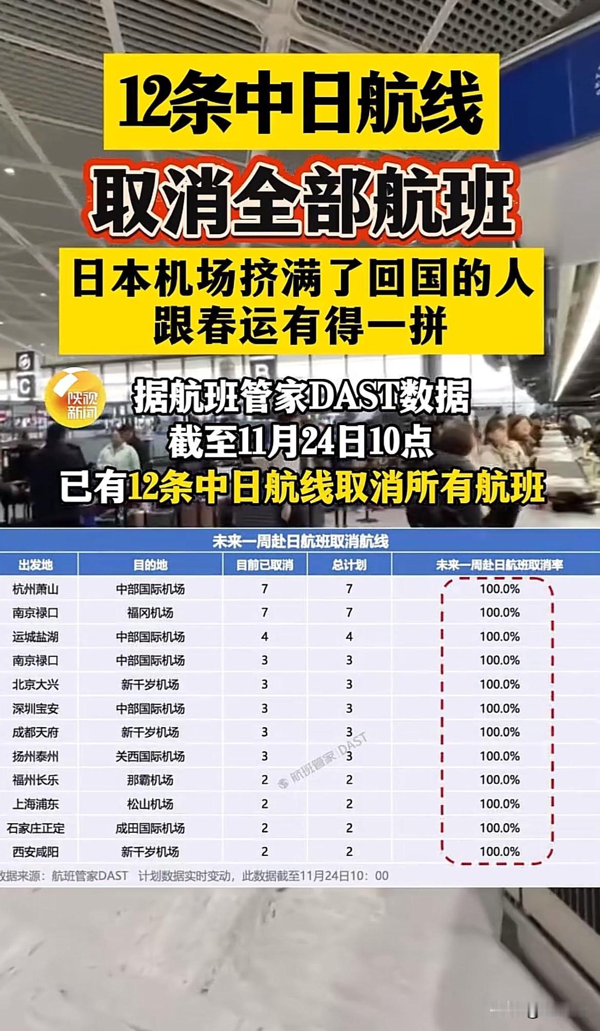 “花钱去日本旅游是我的自由”这波打脸来的不要太快!当初说赴日旅游有多安全,现在返国后有多狼狈! 此前,中国外交部已经提醒近期避免赴日旅行,日本治安动荡,可有些人就是不听劝,非但去了,还要对着干说日本安全的很,现在好了,12条中日航线取消全部航班,想回都不一定能回了。 除了去日本旅游的,也有部分在日工作的,刷到一个博主说一家三口在日是工作签证和家属签证,不担心航班取消,反而担心中日关系恶化,日本停止工作签证,他们要被迫回国。 我想说,大敌当前,舍小家顾大家,一切该以国家为重,团结一致,能回就赶紧回,别等局势进一步升级,要国家出人力物力去接人。管好自己不给国家添麻烦。