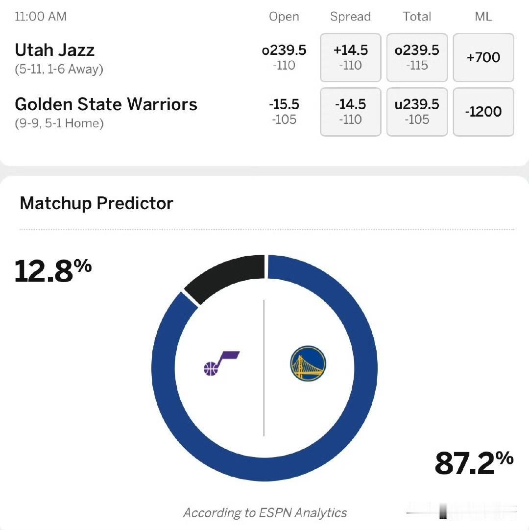 刚战完湖人又战勇士!!!爵士对阵勇士比赛预告,勇士被看好! 爵士今天刚刚在主场输给了湖人,比赛结束后他们就马不停蹄的赶往了金州,因为他们明天上午11点还要背靠背客场打勇士,一起来看一下比赛预告吧。 目前从ESPN给出的预测结果看,勇士以接近9成的概率可以拿下比赛, 这甚至比昨天爵士和湖人的比赛预测还要高,看来勇士很有希望赢下比赛的。 其实不管是从球队实力还是伤病情况,爵士应该都和勇士有些差距,不过不能小瞧他们,爵士的进攻没有问题,他们经常能够打出高比分的比赛。 而且预测给出勇士主场-14.5,这个也差距太大了,这是要奔着15分以上的分差了吧! 勇士队阵容 西部勇士队 新赛季勇士 勇士队阵容安排 金州勇士 爵士