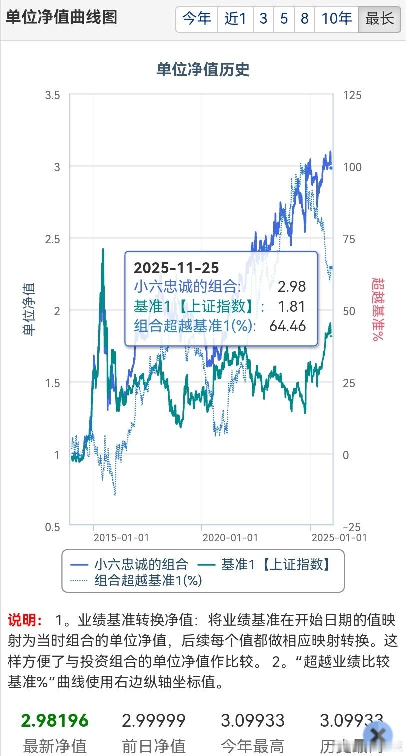 大盘回调200点!我的价值组合将越跌越买大盘回调近200点,不少投资者陷入恐慌,但对价值投资者而言,这正是“别人恐惧我贪婪”的增持窗口期。我的组合虽未能幸免回调,但上周五已开启抄底,后续更将坚持越跌越买——这份底气,源于11年价值投资之路的沉淀。从2014年1元净值起步,到如今2.98元,我的组合用时间证明了价值投资的复利魔力。即便经历今年市场的起起伏伏,截至11月24日收盘,组合年内仍实现1.10%的正收益。更值得关注的是,两年前组合还在2.5元净值附近波动,如今已站稳3元关口,按照这个节奏,再过两年向4元区间冲刺并非奢望。很多人疑惑,为何价值投资能穿越牛熊?核心在于“长期持有”的底层逻辑:前一两年可能面临本金波动的考验,但持有三年以上,基本就是利润在波动。就像我的组合,本金始终是最初的1元,如今的涨跌都是利润在“腾挪”,持有越久,利润蓄水池就越满。市场回调从来不是风险,而是低价买入优质资产的机会。价值投资无需追逐热点,只需坚守低估值、高性价比的核心标的,用时间换空间。你当前的投资组合在回调中是选择坚守还是调仓?你认为价值投资最难的是扛过初期波动,还是长期坚持初心?欢迎在评论区分享你的看法,别忘了点赞收藏,一起见证价值投资的长期力量!