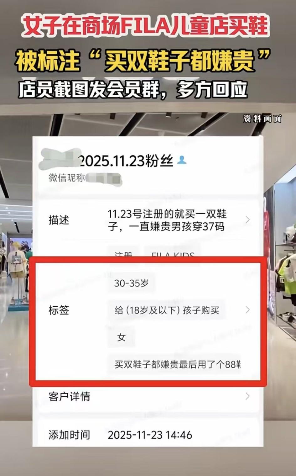 将顾客备注“买双鞋子都嫌贵”,还发到会员群里,这操作也是让人无语! 近日某网友去商场斐乐品牌店购买童鞋,试了三双,买下一双,用券购买也是店员提议的,结果还被这名店员暗戳戳“嫌贵”。 斐乐东西对普通人来说的确不算便宜,一件超薄羽绒马甲也将近1000,小朋友的鞋子打折也要五六百。 关键是店员对顾客的态度,哪有当成“上帝”的意思啊! 店长和稀泥的本事也不咋高明,让人感觉不到她的诚意。 这样的备注哪位顾客都接受不了,这还是已购买的,那试完后不买的呢,又会被店员怎么说?!