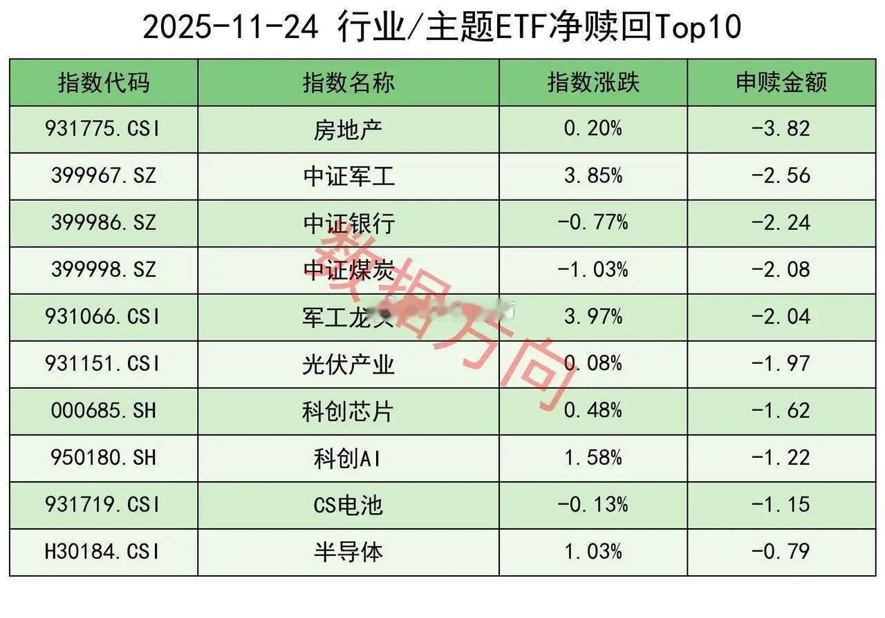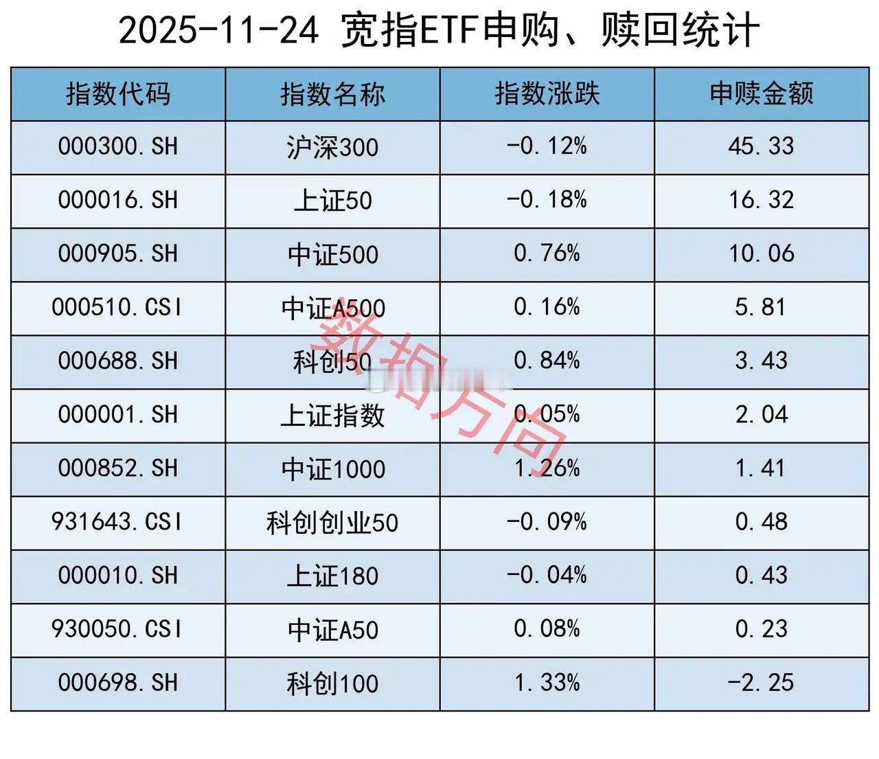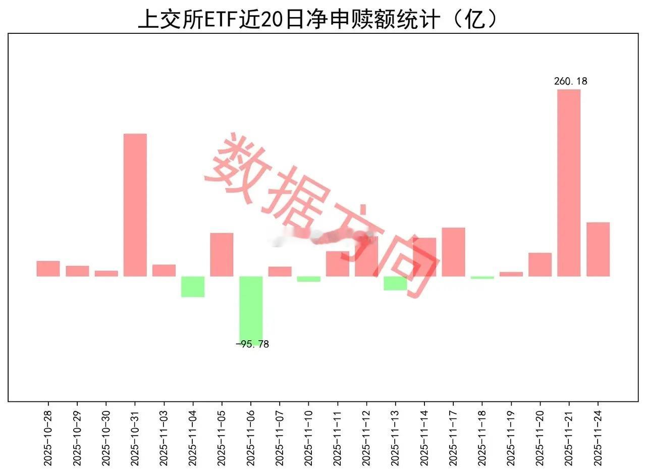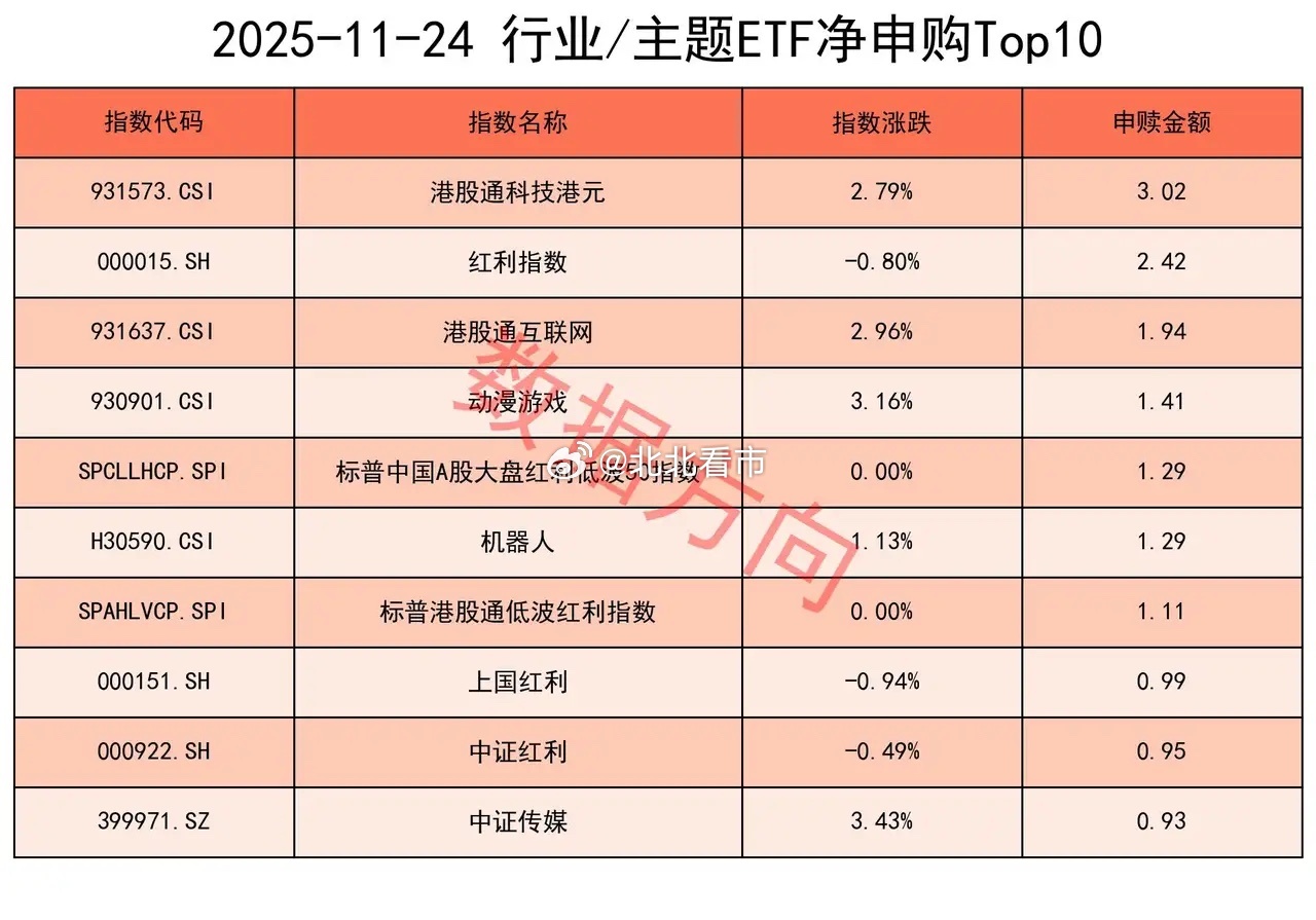 上交所ETF净申购75亿您身边的数据大师,专业分享期指、ETF数据,欢迎关注交流~11月24日星期一,大盘缩量整理,小幅收红,国防军工、AI应用涨幅居前。上证指数涨幅0.05%,上交所ETF合计净申购 75.47亿元。这是连续第4天获净申购。宽指沪深300指数(45.33亿),获最多净申购。上证50指数(16.32亿)、中证500指数(10.06亿),净申购超过10亿。中证A500指数(5.81亿),净申购超过5亿。科创50指数(3.43亿)、上证指数(2.04亿)、中证1000指数(1.41亿)、科创创业50指数(0.48亿)、上证180指数(0.43亿)、中证A50指数(0.23亿),分别获小幅净申购。科创100指数(-2.25亿),被小幅净赎回。行业和主题 港股通科技港元指数(3.02亿)、港股通互联网指数(1.94亿),一起进入申购榜。红利指数(2.42亿)、标普中国A股大盘红利低波50指数(1.29亿)、标普港股通低波红利指数(1.11亿)、上国红利指数(0.99亿)、中证红利指数(0.95亿),一起进入申购榜。其他进入申购榜的还有:动漫游戏指数(1.41亿)、机器人指数(1.29亿)、中证传媒指数(0.93亿)。房地产指数(-3.82亿)、中证银行指数(-2.24亿),一起进入赎回榜。中证军工指数(-2.56亿)、军工龙头指数(-2.04亿),一起进入赎回榜。科创芯片指数(-1.62亿)、半导体指数(-0.79亿),一起进入赎回榜。其他进入赎回榜的还有:中证煤炭指数(-2.08亿)、光伏产业指数(-1.97亿)、科创AI指数(-1.22亿)、CS电池指数(-1.15亿)。