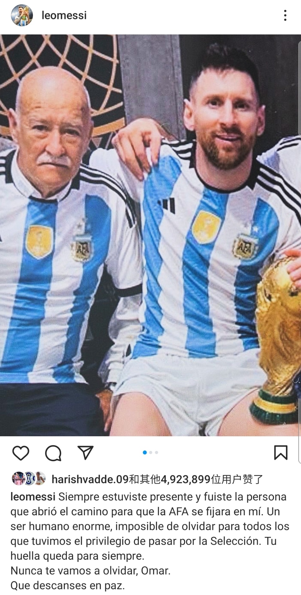 梅西ins悼念索托:你总是在场,你就是为我铺平了道路的人,让阿根廷足协注意到了我。一位了不起的人,对于我们所有有幸为国家队效力的人都永远不会忘记你。你的印记将永远留存。我们永远不会忘记你,奥马尔。愿您安息吧。”