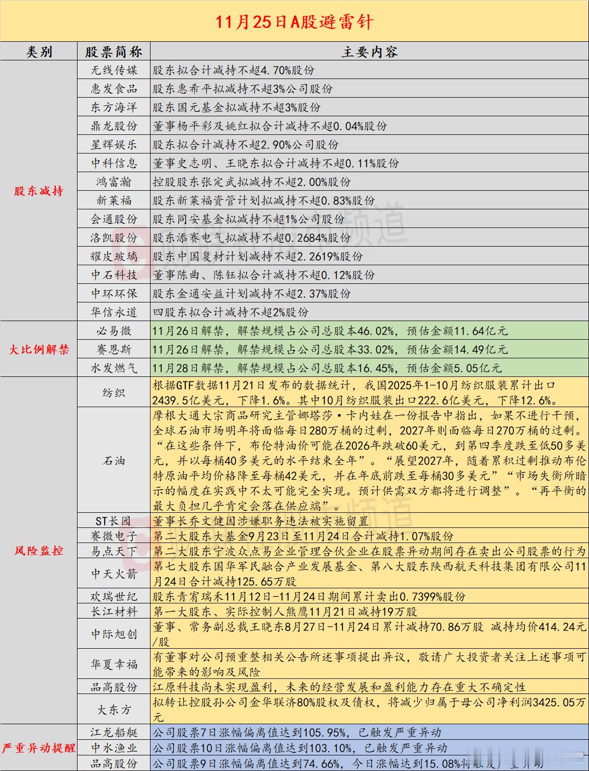 【11月25日投资避雷针:赛微电子、易点天下、中际旭创等人气股遭股东减持】近日,A股及海外市场潜在风险事件如下。国内经济信息方面包括:1)中国纺织品进出口商会数据显示,1-10月纺织服装累计出口2439.5亿美元,下降1.6%;2)上海市网信办开展“AI滥用”专项执法工作;公司方面重点关注包括:1)赛微电子第二大股东大基金9月23日至11月24日合计减持1.07%股份;2)易点天下第二大股东宁波众点易企业管理合伙企业在股票异动期间存在卖出公司股票的行为;海外市场重点关注包括:1)摩根大通称如果不进行干预,布伦特原油可能因过剩在2027年跌至每桶30-40美元;2)德国总理预计美方和平计划无法在27日前最终确定。