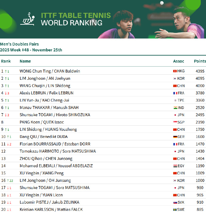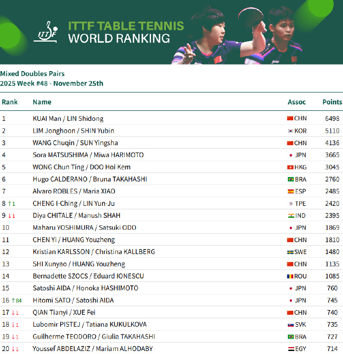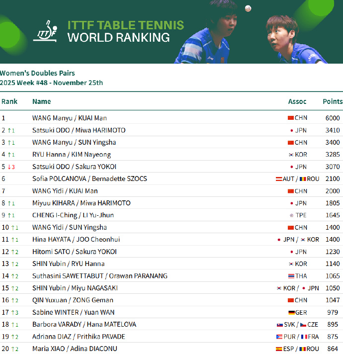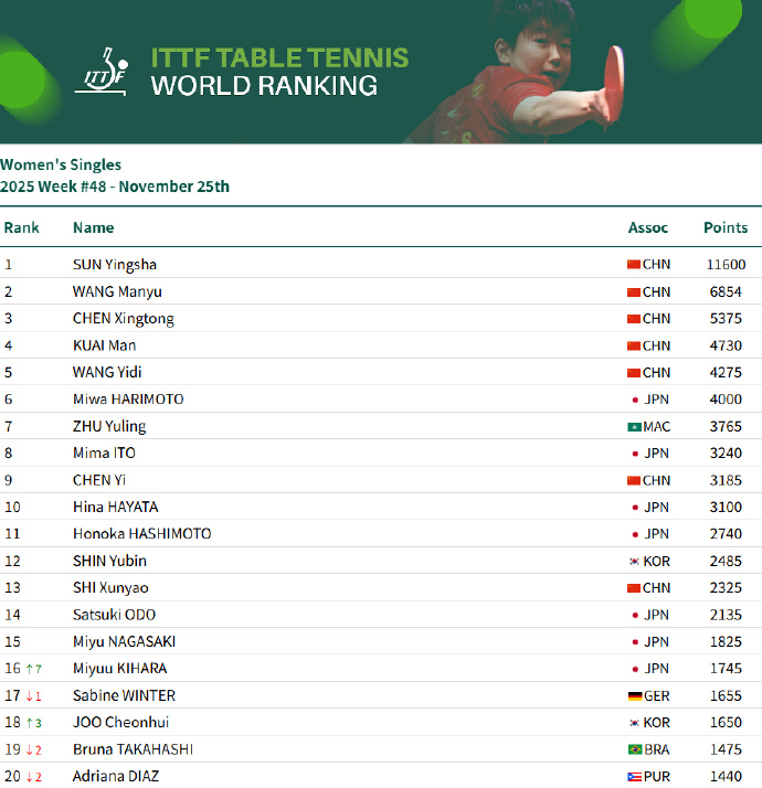 男单:王楚钦9925分、林诗栋位列前二,梁靖崑位列第7,向鹏第11女单:孙颖莎11600分、王曼昱、陈幸同、蒯曼、王艺迪位列前五,陈熠第9男双:王楚钦/林诗栋第3、林诗栋/黄友政第9女双:王曼昱/蒯曼第一、孙颖莎/王曼昱第3、蒯曼/王艺迪第7、孙颖莎/王艺迪第10混双:林诗栋/蒯曼第1、王楚钦/孙颖莎第3、黄友政/陈熠第11
