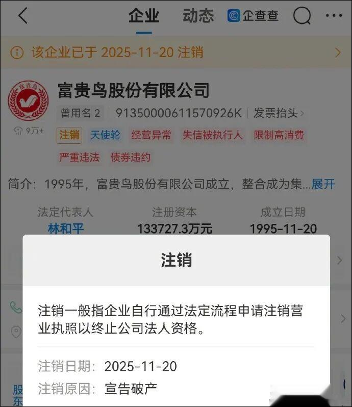 企查查APP显示,近日,富贵鸟股份有限公司登记状态由存续变更为注销,注销原因为宣告破产。