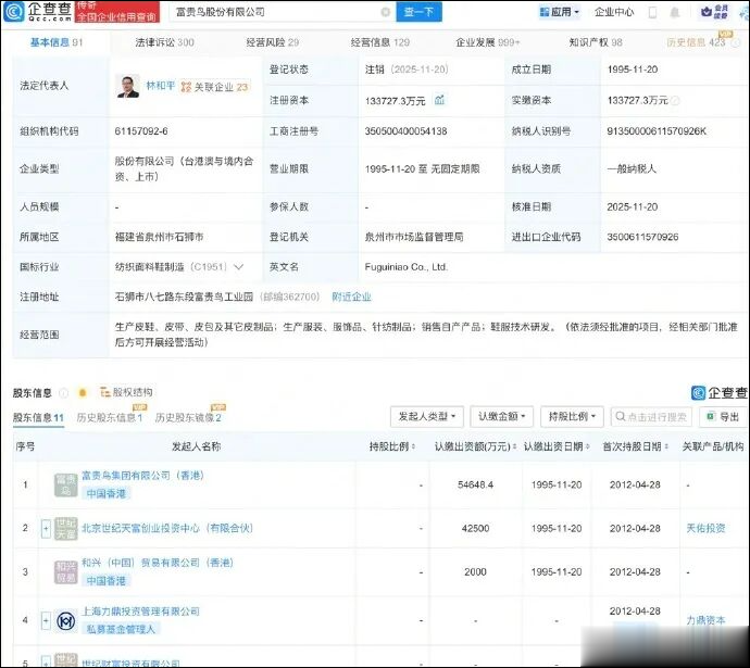 该公司成立于1995年,法定代表人为林和平,注册资本约13.4亿元人民币,经营范围包括生产皮鞋、皮带、皮包及其它皮制品等,由富贵鸟集团有限公司(香港)等共同持股。