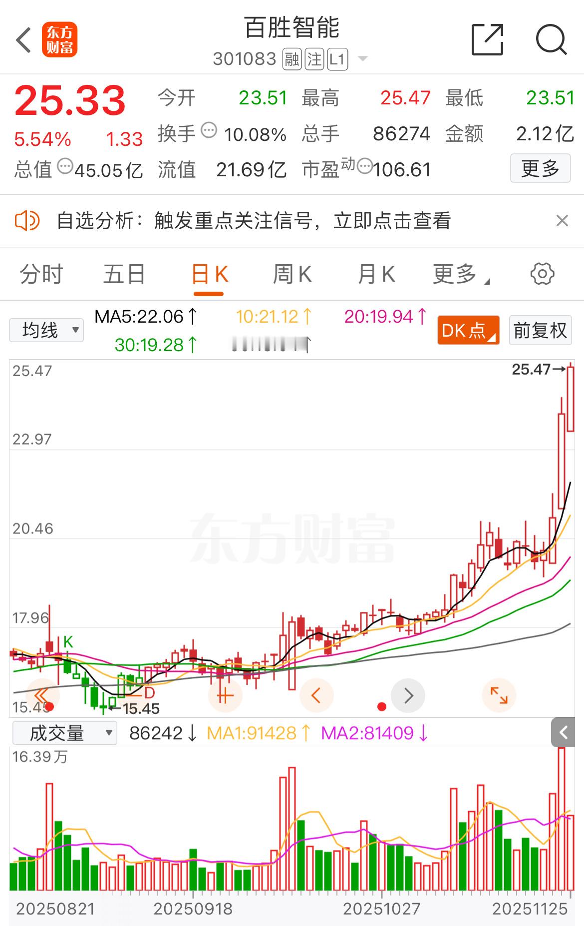 百胜智能 开始远离五日线了,注意下了!