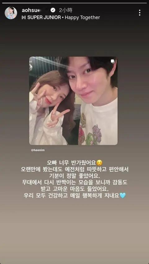 熟悉的「Cherry欧巴」!。Super Junior已落幕的《Super Show 10》台北场,一些和成员有交情的台湾艺人都悄悄现身力挺,包括曾和希澈在经典节目《我们结婚了》组成「大腿夫妇」(又有「希雪夫妇」之称)的郭雪芙,两人也总算见面同框! 郭雪芙在第一天14日的场次就现身力挺希澈,默默地买票默默入场,装扮也相当低调。从她发出的照片,可推测她相当早就到大巨蛋现场,才能和「澈柱」零距离合照,她写下:「欧巴谢谢展现了这么帅的演出,欧巴和成员全都太帅了,今天结束后一定要好好休息。明后天也会继续为你加油!真的很感谢,是非常美好又帅气的表演。」 她标记希澈,希澈回覆:「谢谢雪芙呀!!亲自买票看演出的雪芙,演出节目后没来看看我就走的雪芙,粉丝模式观看的雪芙。」这对「希雪夫妇」隔空互动再次引起讨论!希澈也发现郭雪芙送了花篮到现场,一句经典的爱称「Cherry欧巴」相当回忆杀,郭雪芙简单祝贺演出顺利,署名写「你的前夫人雪芙」,让人会心一笑。 「希雪夫妇」演出的《我们结婚了》是2014年的《我们结婚了国际版》,两人互动之中最令人印象深刻的,莫过於婚纱照「激烈」接吻,尺度大开一时成为话题。而两人下车之后仍有互动,上一次也是透过IG隔空互动,2022年郭雪芙整理东西发现了一叠照片,感性写下:「Cherry欧巴,好久不见。最近过得好吗?好想你。祝你身体健康。」希澈转发写下:「谢谢雪芙,无论如何都要健康,会和建熙一起去玩的。」建熙正是希澈学生时期到现在的挚友,当时在节目上希澈曾介绍两人认识。 隔空互动果然不够,希澈最新发文透露带艺声和郭雪芙,三人见面吃饭了!希澈发文写下:「时隔11年再次相见的郭雪芙。记忆中的Cherry欧巴、花花公子。时间过得太快了,我们都不要生病,长长久久这样下去吧。」郭雪芙留言:「Cherry欧巴很开心见到你,感谢这么愉快的时光。」 郭雪芙转发限时动态写了更多话,看起来更多回忆涌了上来:「欧巴真的很开心见到你。虽然好久不见了,但是仍像以前一样温暖、让人安心,心情真的很好。看到你在舞台上再次闪耀的模样,既感动又感激。我们都要健康幸福地过每一天。」 见希澈发文,台湾E.L.F.推测三人应是16日《SS10》末场结束后相约,也难怪其他成员吃金猪食堂时,不见希澈和艺声身影。希澈把握机会把这名默默观看演出的粉丝郭雪芙约出来见面,让人感受特别珍贵,当然也唤醒不少观看节目的回忆.