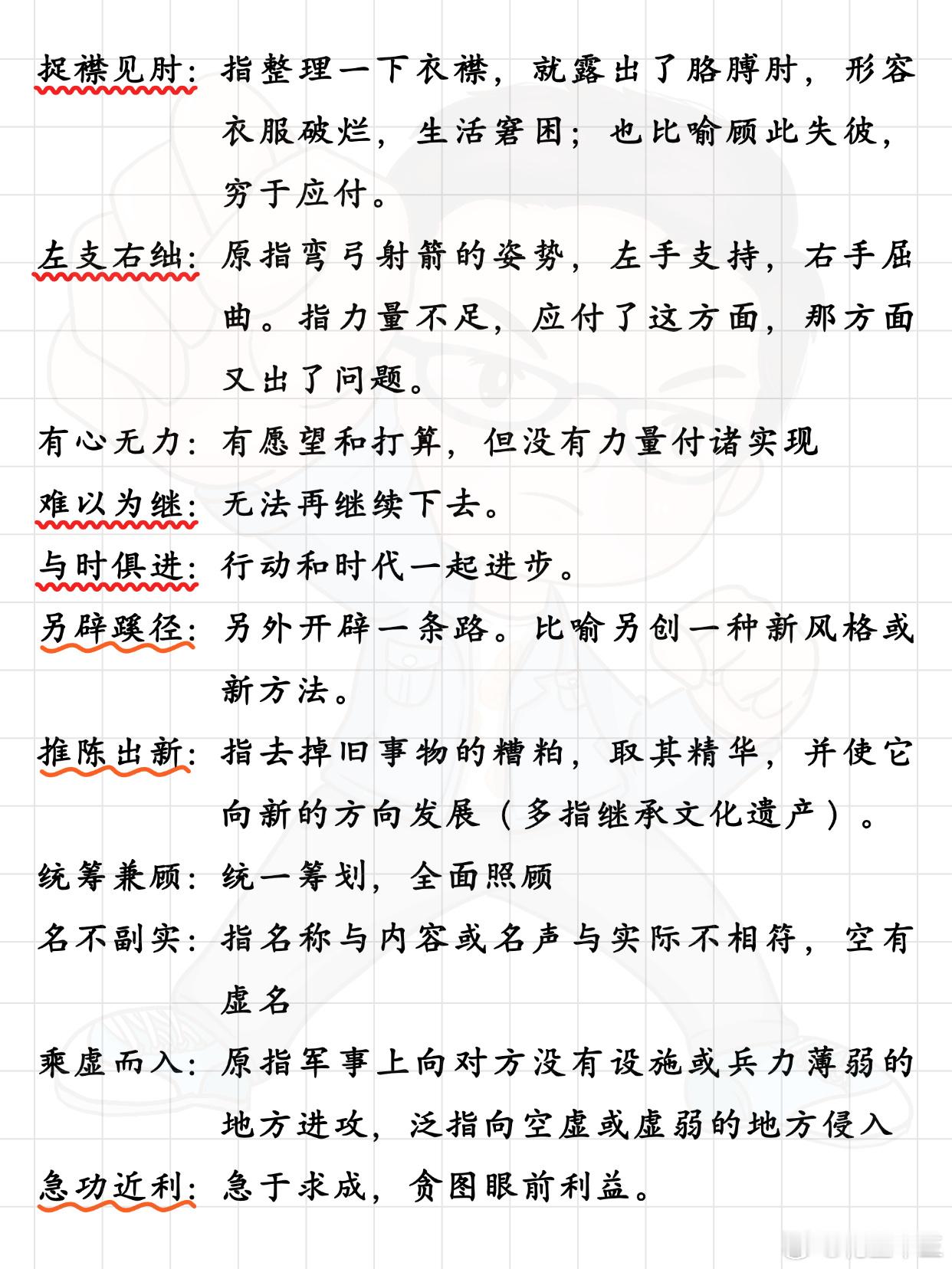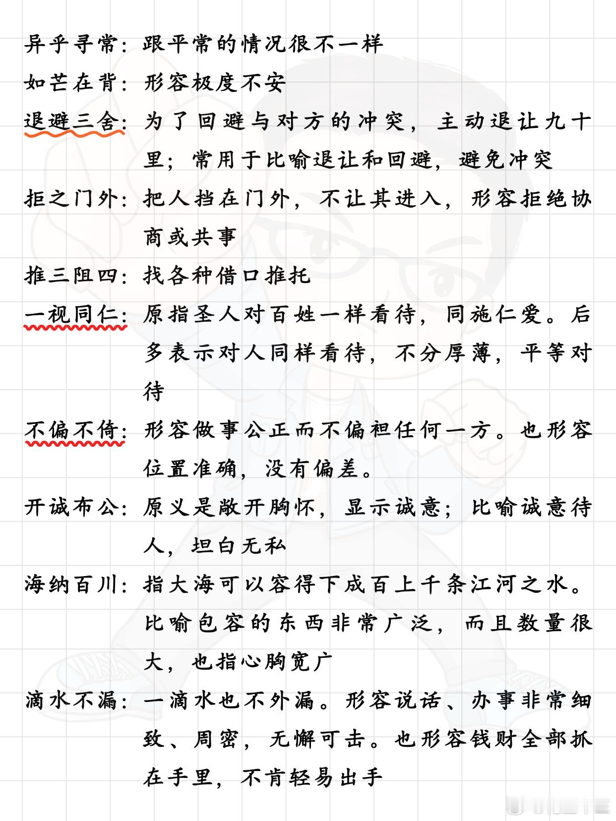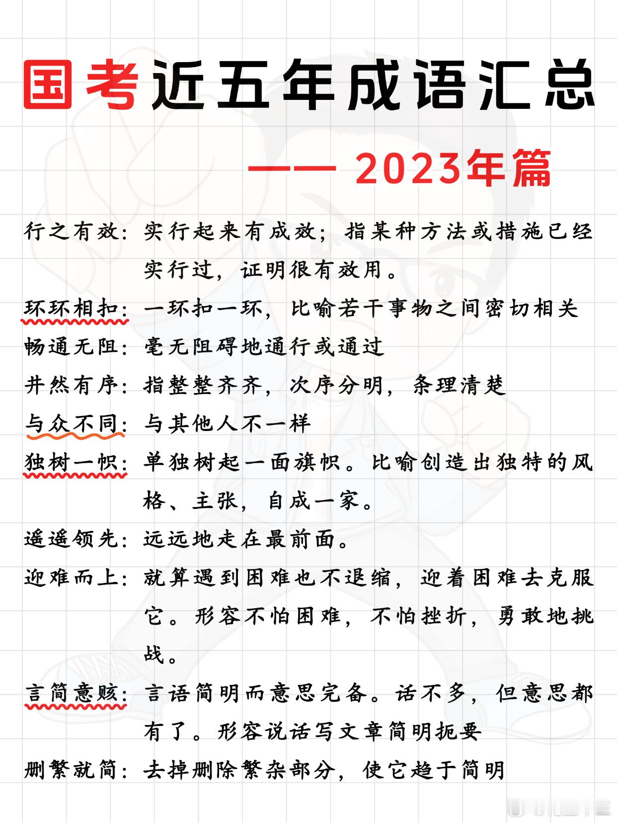 国考近五年成语整理【2023年篇】21/22/23年成语已更新完毕!明天更新24/25年成语红色波浪线:代表近五年出现2次橙色波浪线:代表近五年出现3次蓝底色 :代表近五年出现4次
