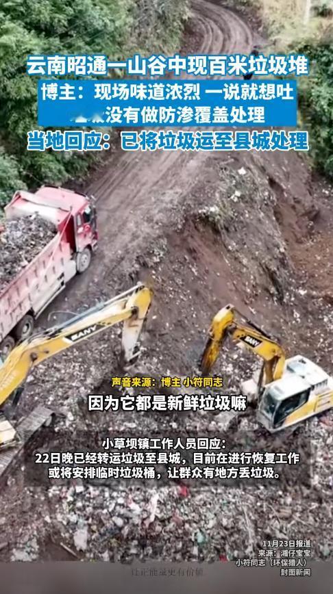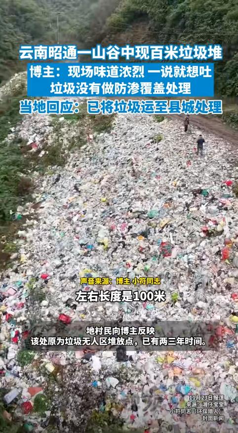 “严查到底!”云南彝良,一男子开车行驶在山谷中时,突然发现路边堆放了上百吨的垃圾,他下车检查后发现,有些垃圾的日期非常新,而且还找到了焚烧的医疗垃圾!有关单位了解后,立即展开清理工作。网友:这才是互联网的意义! 据新京报11月24日报道,事情是这样的,当天,一位姓郭的先生开着车想进山里转转,看看秋天的景色。 车子在山路上七拐八绕,越往里走,他心里越觉得不对劲,好好的山林,怎么飘来一股子说不出的臭味?这味道越来越浓,熏得人直皱眉头。 他往前又开了一段路,眼前的一幕让他瞬间惊呆了,只见不远处的山坡上,白花花的一大片,像下了一场奇怪的“雪”。 郭先生把车停在路边,下车走近一看,气得差点没骂出声来,这哪里是什么“雪”,这分明是一座垃圾山! 这座垃圾山少说也有上百吨,沿着山坡铺了下去,起码得有几十米长,塑料袋、吃剩的饭盒、破衣服、烂鞋子,什么都有,胡乱地堆在一起。 郭先生心里咯噔一下,这要是普通的垃圾也就算了,可他仔细一看,发现事情远比想象的要严重得多。 垃圾堆里混着好多碎玻璃瓶,看起来像是医院用的输液瓶,更让他头皮发麻的是,他还看到了一些带着血迹的纱布和用过的针管。 在一处角落,还有一大片黑乎乎的灰烬,里面夹杂着没烧干净的医疗废物包装袋,明显是有人在这里焚烧过医疗垃圾。 郭先生随手捡起一个食品包装袋,上面的生产日期竟然是11月初的,说明这些垃圾是最近才倒在这里的。 这简直太无法无天了!他抬头看了看周围的环境,这山谷下面就是一条小溪,溪水潺潺地往下流。 他知道,山脚下好几个村子的人都指着这条溪水灌溉田地,甚至直接当生活用水,要是这些垃圾里的脏东西,特别是医疗垃圾里的病菌,顺着雨水渗进土里,再流到小溪里,那后果简直不敢想。 村民们喝了这样的水,种出来的庄稼还能吃吗?万一再传播点什么病,那可就出大事了,想到这里,郭先生又气又急。 他立刻拿出手机,对着这座触目惊心的垃圾山开始录像,他把镜头拉近,特意拍下了那些医疗废物的特写,还有那些没烧干净的痕迹,他一边拍一边觉得心痛,好好的绿水青山,怎么就被人糟蹋成这个样子? 男子把视频发到了网上,希望能够引起关注,果不其然,视频一发出去,立马就像点燃了炸药桶,网友们看到山谷被糟蹋成这样,都气坏了。 有人说:“这帮人胆子也太大了,这跟投毒有什么区别?必须抓起来!” 还有人说:“医疗垃圾是能随便乱倒的吗?这是要负法律责任的!必须严查到底,看看是哪家医院或者诊所干的!” 很多云南本地的网友更是心疼不已,留言说:“我们靠山吃山,靠水吃水,这帮人为了自己省事,就把垃圾倒我们家门口,良心被狗吃了吗?” 网络的力量是巨大的,这件事很快就传到了当地有关部门的耳朵里,相关部门的反应速度非常快,可以说是雷厉风行。 接到消息的当天晚上,环保、城管、卫健等部门就组成了联合工作组,连夜赶往现场核实情况,第二天一大早,天还没亮透,好几辆大卡车和一台挖掘机就开进了山谷,二十多个穿着防护服的工作人员也赶到了现场。 清理工作立即展开,工作人员先小心翼翼地把那些医疗废物从垃圾堆里分拣出来,装进专门的黄色密封袋和箱子里。 这些都是危险品,必须送到专业的危废处理中心进行无害化处理,剩下的生活垃圾,则由挖掘机和清运车一车一车地运走,拉到正规的垃圾处理厂。 垃圾清走后,还有专门的消毒人员背着喷雾器,对整个山坡和附近的土壤、水源进行了反复消杀,确保不留下任何病菌隐患。 又过了一天,郭先生心里还是不踏实,他又开着车来到了那个地方,眼前的景象让他长长地舒了一口气。 原来那座恶臭熏天的垃圾山已经消失得无影无踪,山坡重新露出了泥土的本色,虽然还有些痕迹,但空气中那股难闻的味道已经散了。 几名工作人员还在现场做着最后的收尾工作,看到这一幕,郭先生心里的一块大石头总算是落了地,他觉得,自己当初那个随手拍摄的举动,真的做对了。 这件事也给我们所有人敲响了警钟,绿水青山需要我们每个人去爱护,那些为了省一点处理费,就把成吨的垃圾,甚至是危险的医疗废物,偷偷倒在偏僻山沟里的人,他们的行为不仅仅是缺德,更是违法犯罪。 他们图一时方便,却可能毁掉一方水土,危害无数人的健康,这种行为,必须受到最严厉的惩罚,绝不能姑息。 同时,我们也要为那些快速反应、负责任的部门点赞,为像郭先生这样有正义感的普通人点赞,正是因为有这样的监督和行动,我们的家园才能少一分污染,多一分洁净。 保护环境,从来都不是一句空话,它需要我们每个人都“多管闲事”,看到不平事,敢于站出来发声。 信源:新京报2025-11-24——云南昭通一山间有大量垃圾堆积 当地回应:系生活垃圾累积 已清理
