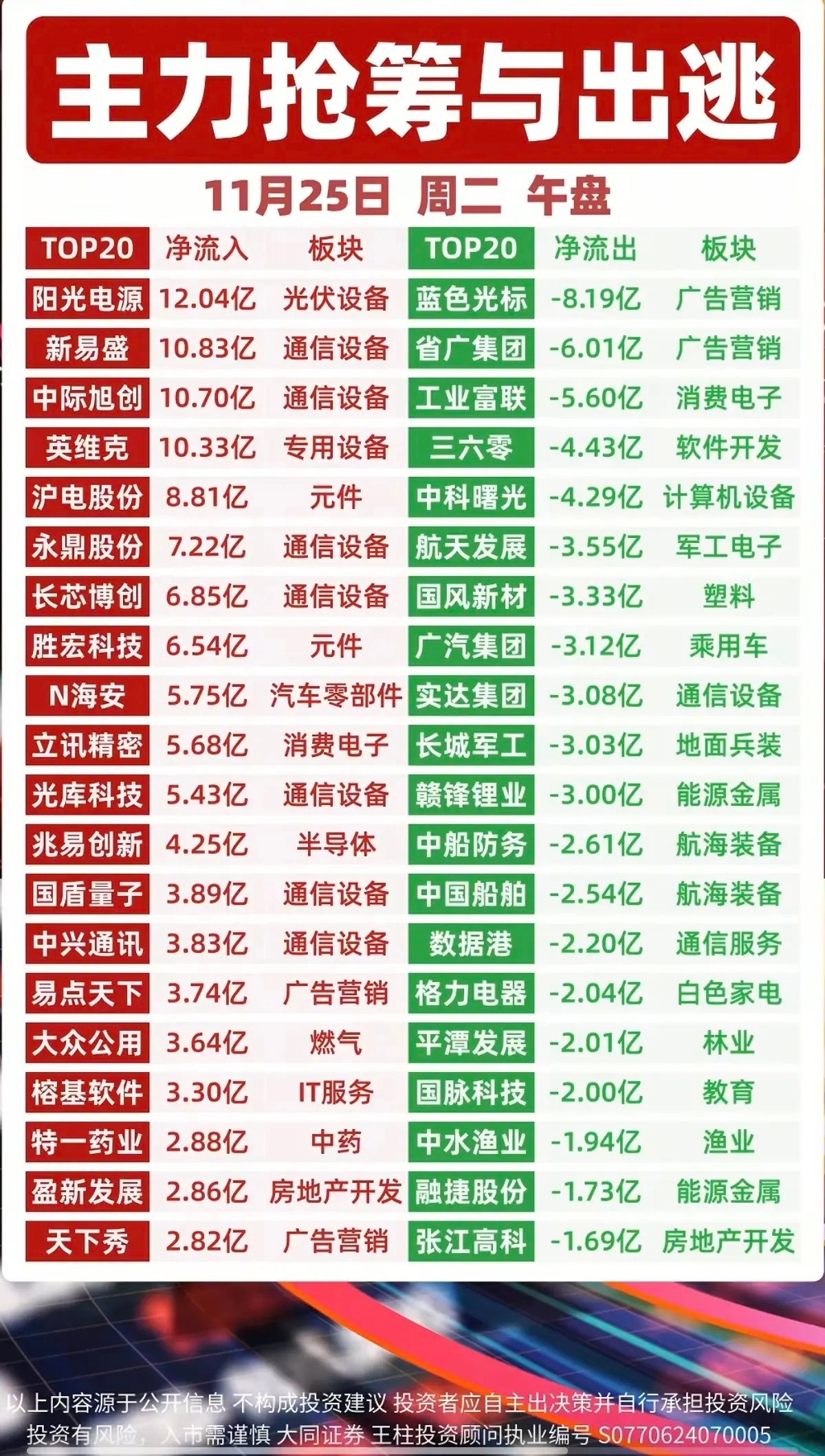 周二 抢筹出逃:大资金流向追踪!能源金属碳酸锂调整接近尾声,福建板块继续调整。整个市场专用设备,消费电子,通信设备软件开发,光伏储能,黄金白银,化学制药,光通信,激光雷达,房地产相关板块等资金抢筹。造船,军工,机场,农业等资金出逃,跌幅明显