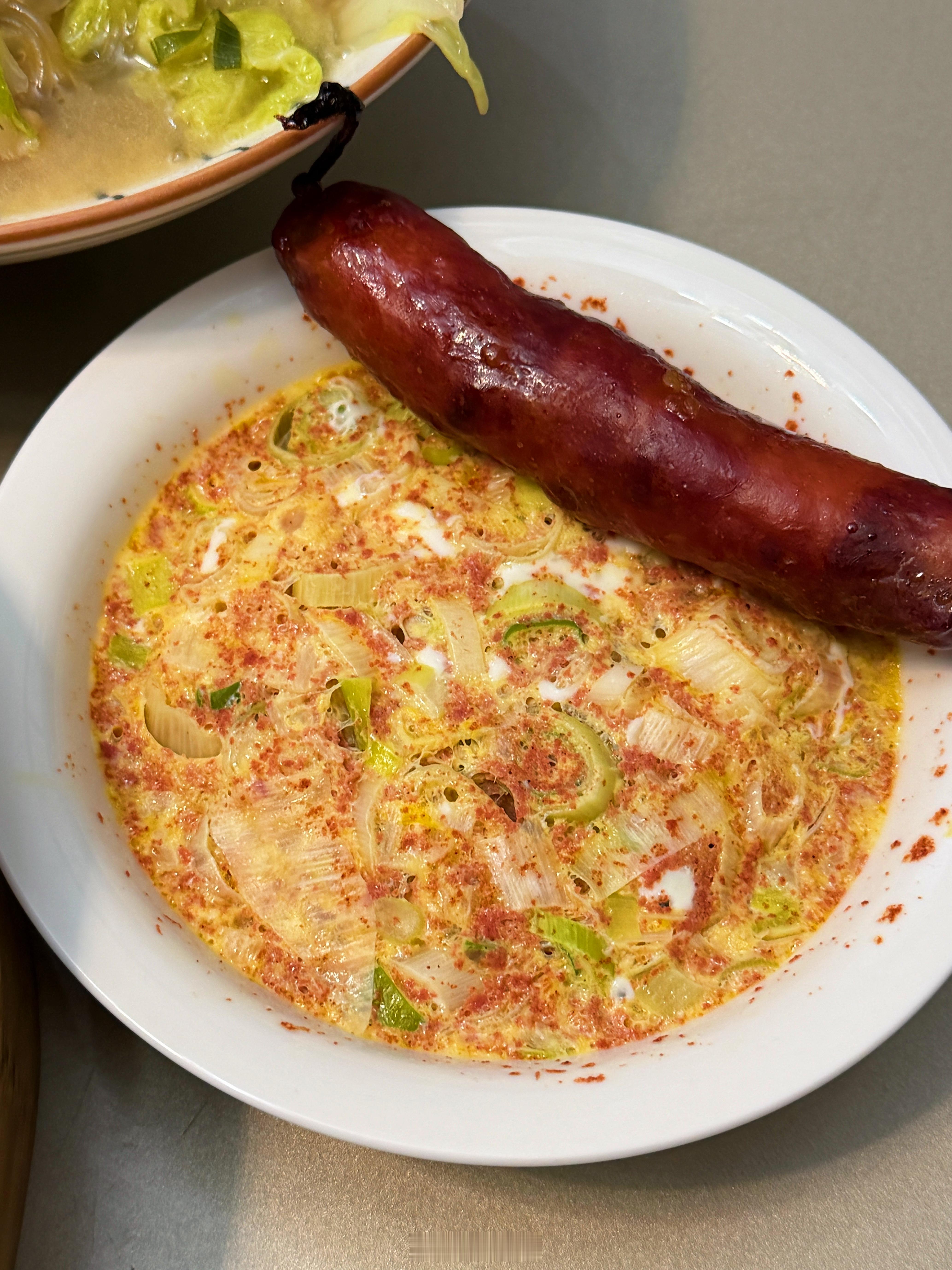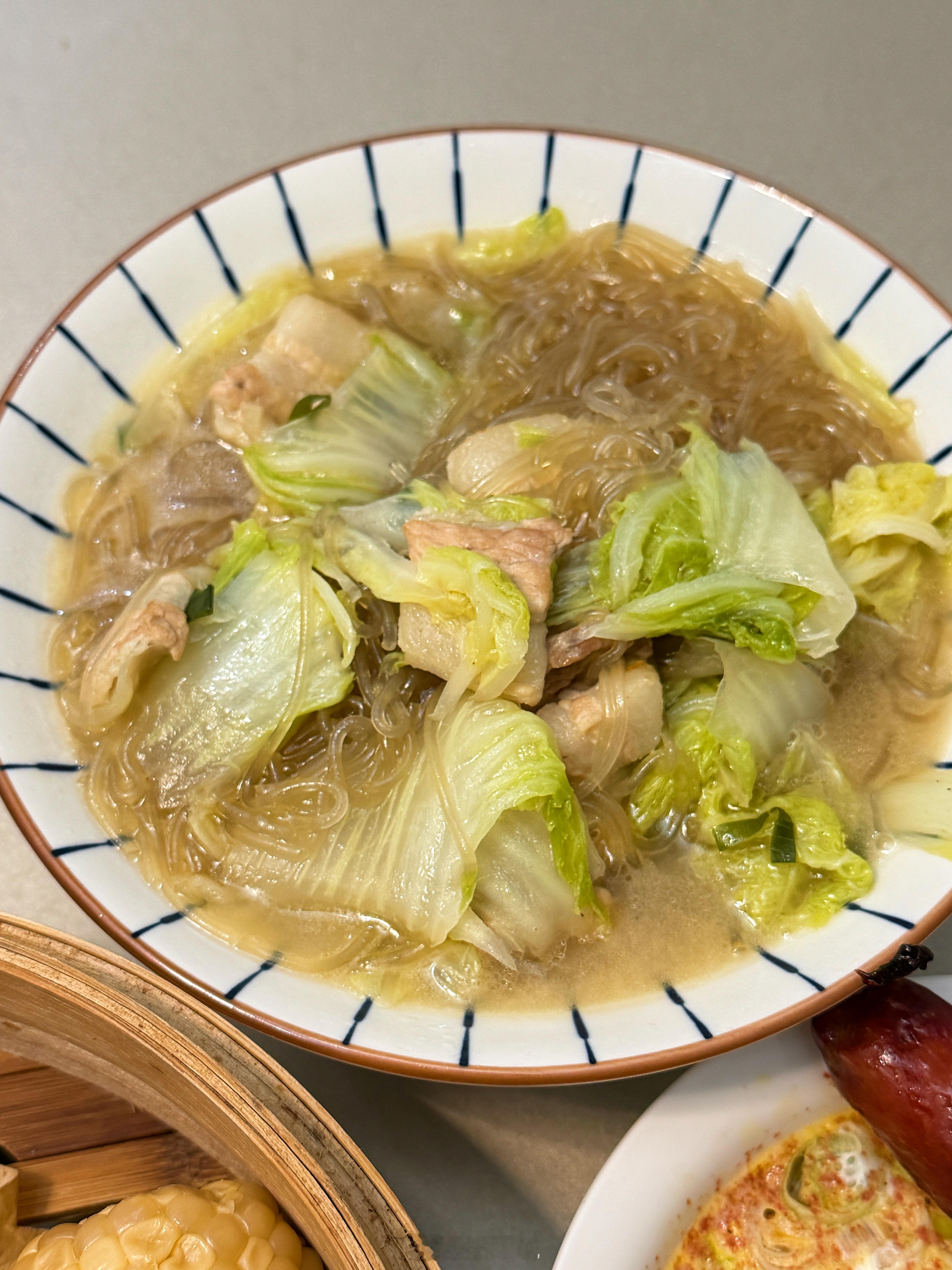 山东省饭,冬天限定版,白菜猪肉熬粉条,蒸虾酱,蒸香肠,配馒头最香,今天配炸面鱼
