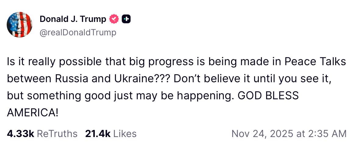 特朗普在Truth Social 上表示,俄乌和平协议“似乎正在取得初步进展”,并建议公众“不到最后一刻别轻信,但或许会有好消息”。他没有透露谈判内容或相关细节。俄罗斯方面则公开否定欧洲提出的和平方案,称其“不合适”,却将特朗普版本视为更“可接受”,因为其中包含对莫斯科有利的重大让步。据 POLITICO 报道,普京正坐视乌克兰和欧洲为修改特朗普方案而忙乱,显示克里姆林宫认为,无论最终达成倾向俄方的协议还是继续战斗,局势对俄罗斯都不会太坏。 与此同时,日内瓦的美乌谈判也在朝着新的方向推进。双方经过近乎破裂的高压磋商后,重写出一份19点草案,删除了此前要求乌克兰割地、限军和大赦的最具争议条款,并将领土安排、北约与美俄关系等核心议题留待特朗普与泽连斯基亲自定夺。乌克兰官员透露,美方在多项关键点上表现出更大灵活度,几乎所有乌方提出的修改都被纳入,其中包括撤下乌军缩编至60万的条款,并重新设计涉及战犯责任的安排。尽管谈判最终气氛缓和,但双方都承认,真正的决定性问题仍需最高层拍板。 这一进展与莫斯科的信号交织在一起,使外界对后续动态更加关注。美国将把最新草案带回华盛顿向特朗普汇报,同时准备视情况与俄罗斯接触。克里姆林宫则声称尚未获悉文本,但继续通过舆论操作表明其对“特朗普版本”比对欧洲方案更为开放。换句话说,外交舞台上的政治算计与战场现实正同步收紧,为下一步可能的突破或僵局铺设了复杂背景。 图片来源于网络