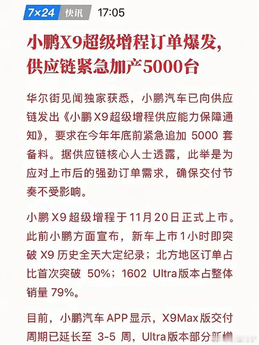 再上一台阶!小鹏X9超级增程大定锁单量超预期,今日官方APP显示等候时间再延长:Max版从3-5周延至4-6周,Ultra版从4-6周调为5-7周。订单持续火爆,期待产能提升保交付!小鹏X9超级增程 新能源汽车 大定锁单破纪录