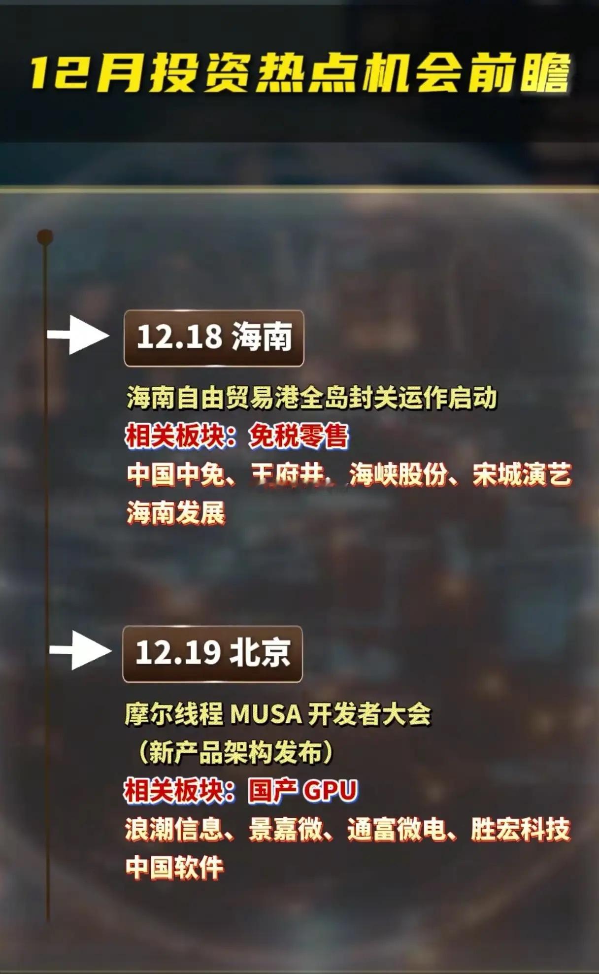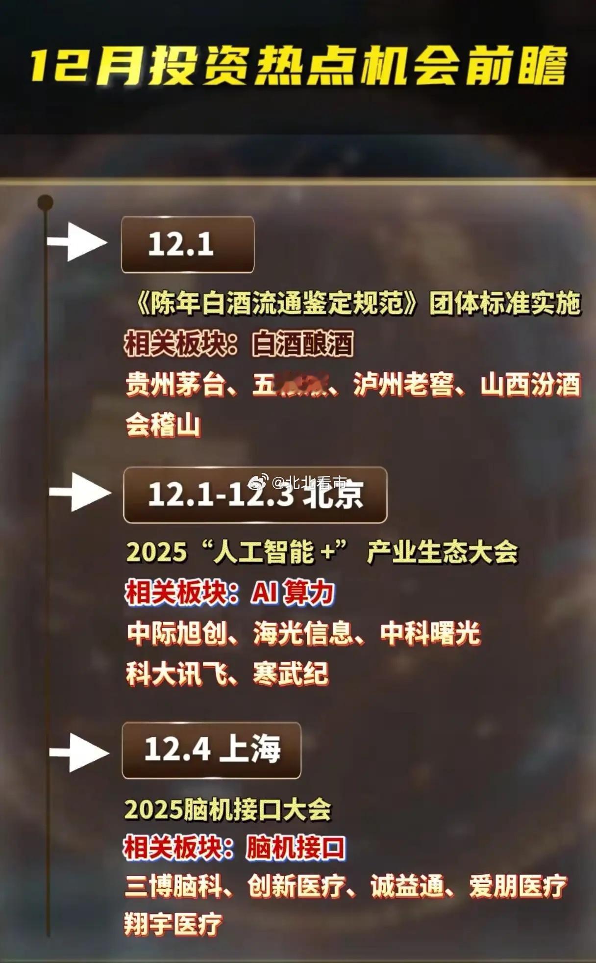 12月投资风口在哪?这7大事件将引爆AI、白酒、免税三大主线12月的A股,正被一场“事件驱动型行情”点燃——从白酒规范到AI算力,从脑机接口到海南封关,7大关键事件将精准引爆细分赛道。12月1日起,《陈年白酒流通鉴定规范》落地,贵州茅台、五粮液等头部酒企的老酒流通将更规范,库存价值或被重估;同期“人工智能+”产业生态大会召开,中际旭创、海光信息等算力企业有望释放新订单。更值得关注的是“硬科技+政策红利”双主线:12月4日脑机接口大会将催化三博脑科等医疗标的;12月18日海南封关启动,中国中免等免税零售企业将直接受益于“零关税”政策;而摩尔线程MUSA开发者大会的国产GPU新品,或成为景嘉微等企业的技术突破窗口。这些事件并非孤立热点,而是“消费复苏+科技自主+区域政策”的年度收官布局机会——踩准节奏,就能握住12月的投资密钥。